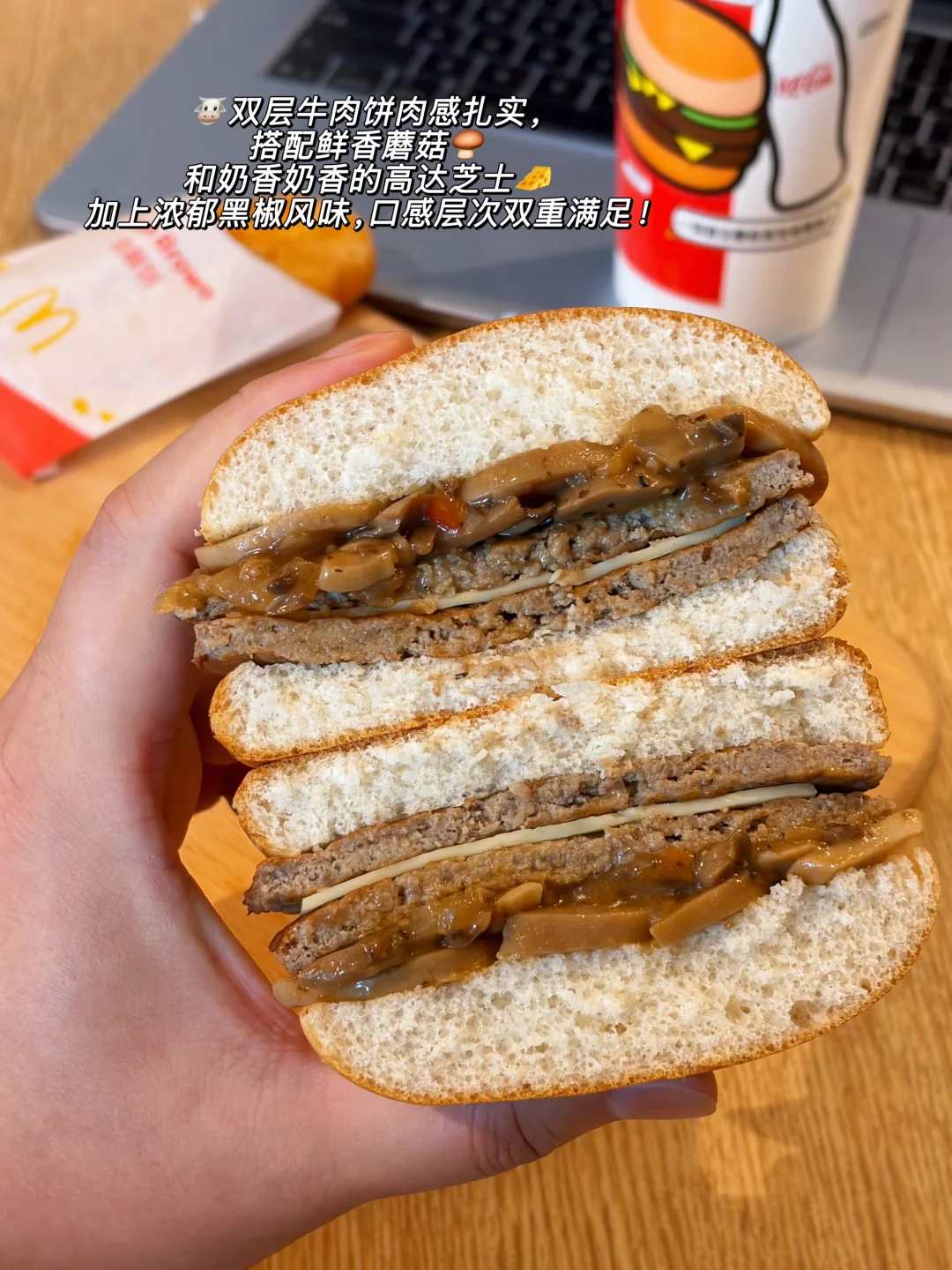 双层牛肉饼肉感扎实,搭配厚切鲜香蘑菇和奶香奶香的高达芝士,加上浓郁黑椒风味,口感层次双重满足!!