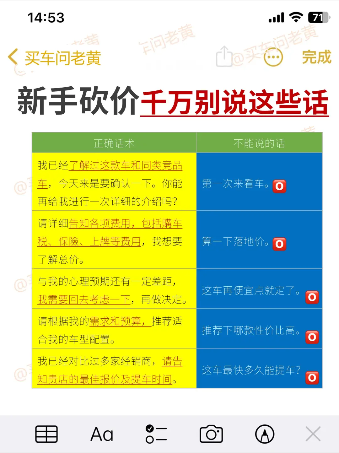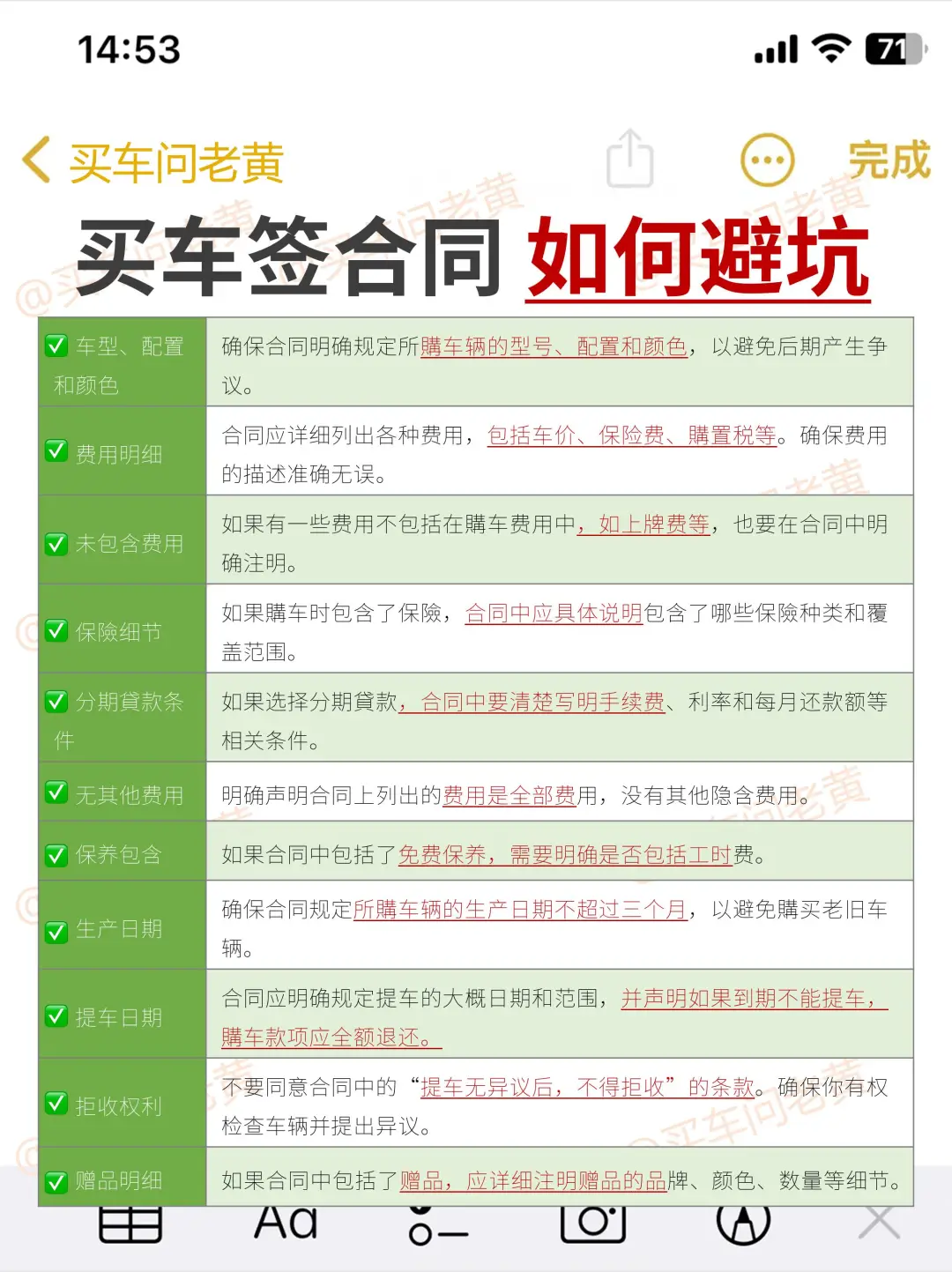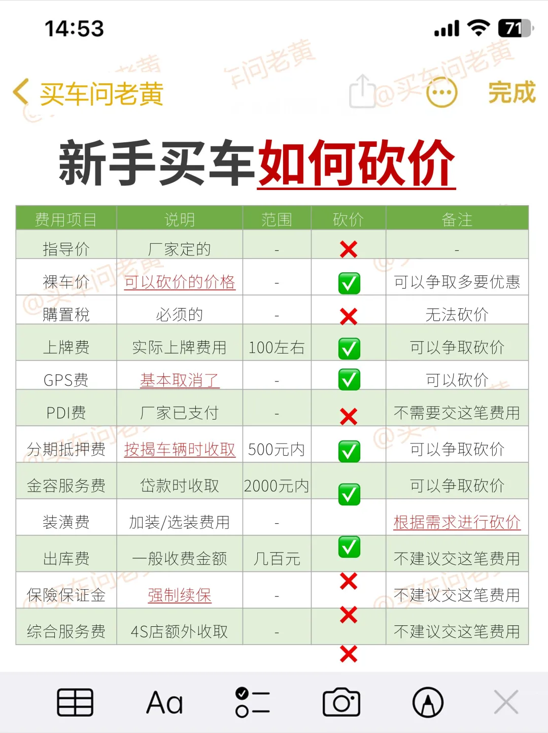 一、 选对时机,事半功倍 月底/季度末: 销售冲业绩,是谈价的最佳时机。 新车上市: 老款车型清库存,优惠力度大。 工作日下班前: 利用销售急于成交的心态,更好说话。 二、 砍价技巧,直击底线 前期功课: 网上查好真实车主成交价,做到心中有数。 货比三家: 多店询价,甚至对比周边城市报价,获取底牌。 谈现金优惠: 坚持要直接的车价减免,避开“综合优惠”陷阱。 善用策略: 可找权限更高的领导谈;或用“分期低价”去谈全款;谈妥后假装犹豫,可能逼出最后优惠。 三、 精打细算,看透费用 购置税: 约为 裸车价 ÷ 11.3。拒绝“低开发票”,否则影响保险理赔。 上牌费: 成本几百,可争取减免。 服务费: 问清名目,避免乱收费。 四、 实用赠品,写入合同 优先索要 油卡、含工时机油的保养券、品牌记录仪、高质量贴膜。所有赠品均需在合同中注明。 五、 车险购买,按需配置 必买三样: 交强险、车损险、第三者责任险(建议200万起)。 推荐补充: 驾乘险、医保外用药责任险,保障更全面。 六、 签合同,细节定成败 写“订金”非“定金”,确保可退。 明确细节: 车型、配置、颜色、赠品、提车日期、费用明细、违约补偿均需列明。 拒绝问题车: 合同注明拒收库存车(国产>3个月,进口>6个月)、运损车等。 七、 验车要仔细,杜绝后患 外况: 光线充足下,环绕检查车漆、轮胎、玻璃有无损伤。 内饰: 检查座椅、内饰有无瑕疵,测试所有电子设备功能。 核心: 里程数应低于50公里,检查底盘、发动机舱有无油渍,胶条密封是否完好。 八、 提车凭证,一件不少 关键证件: 机动车登记证书(大绿本,贷款则抵押)、购车发票、车辆合格证。 随车材料: 两把钥匙、三包凭证、保养手册、保险单。 工具: 备胎、千斤顶、三角警示牌等。 总结: 钱未付清,主动权在你!耐心核对每一步,方能省钱省心提好车 如里您觉得有用,请👍➕🌟, 买车一定用的上!主页更多汽车知识~ ✔️✔️✔️✔️✔️✔️✔️✔️✔️✔️ 老黄从事汽车行业10多年 买车用车关🐷老黄: 購车全程指导 买车避坑 给底价 用车技巧