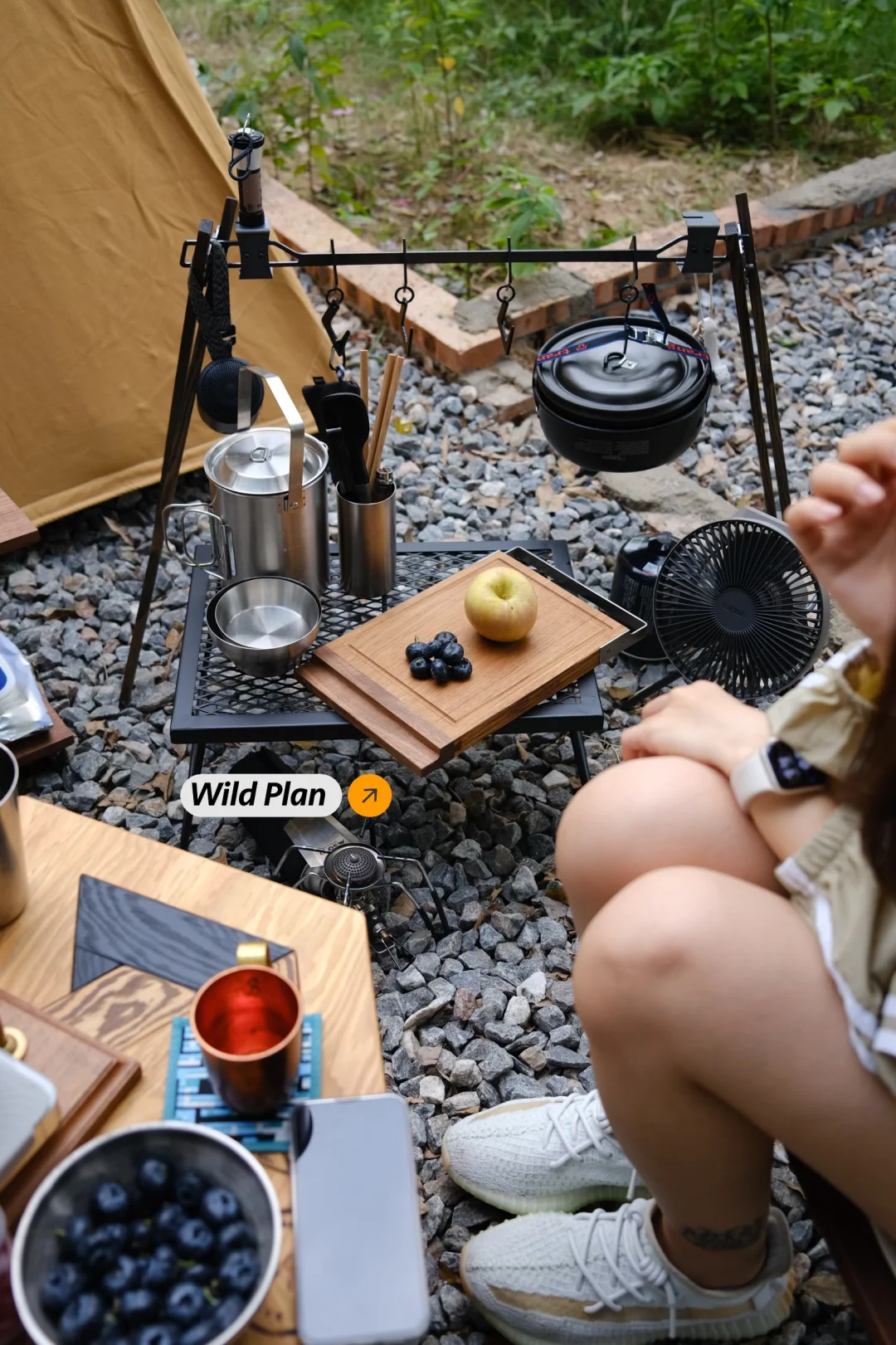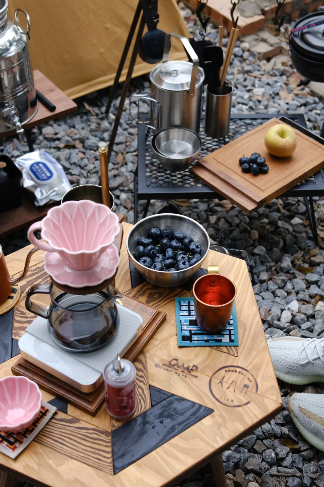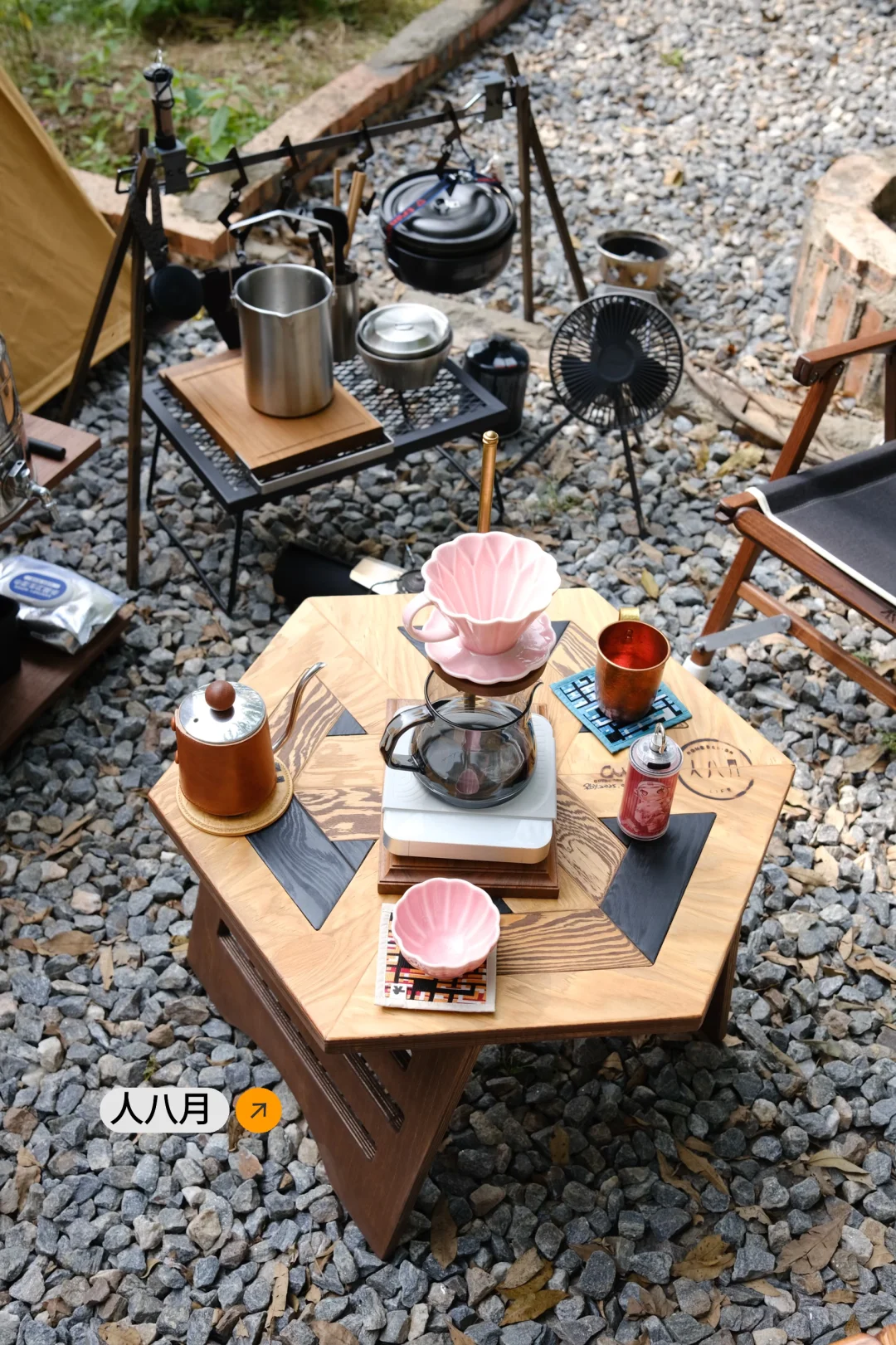 终于淘到心怡已久的人八月六角桌,人八月与春帐这对cp组合自带复古标签,一直很期待他俩搭配的画面感,这次终于成功打卡✅ 一般我的露营搭配是先确定好三大件:帐篷,天幕,桌椅,然后就是氛围感小物,这次搭配了一些plan 的实木小物,有砧板,咖啡架,灯罩 最后再是置物和收纳方面,这次用的桌边置物架是梁总手打的轻量化钉架,钢钉打入土里带来更好的稳定性,搭配自己打磨涂油的胡桃木层架,颜值功能都在线,这套置物架最大的特点是可以根据不同需求定制不同长度宽度的木板