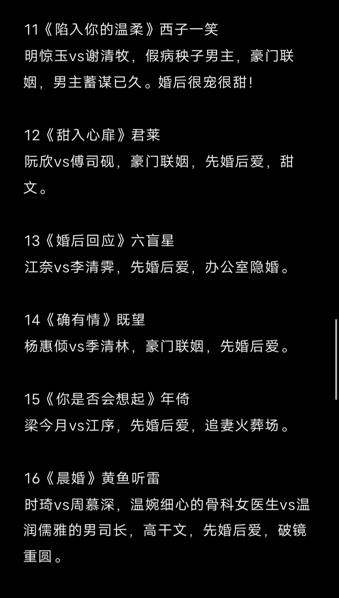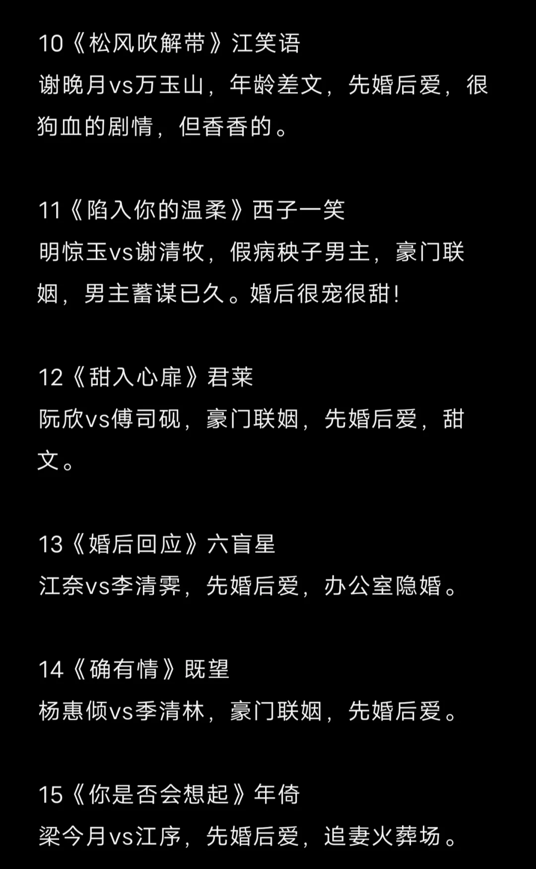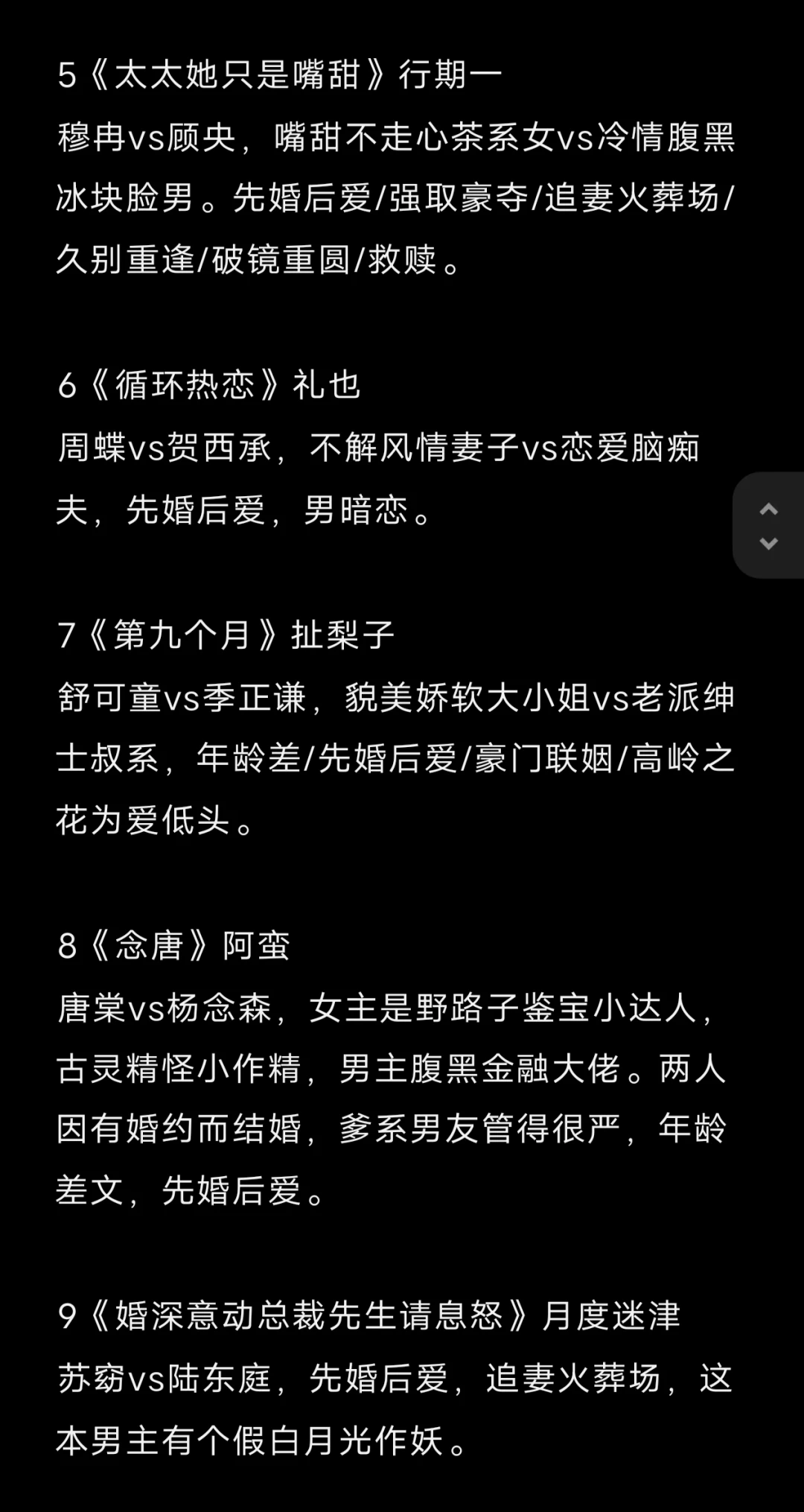 1《八十年代J婚纪事》许多小鱼 2《金枝》青桃气泡水 3《河清海晏》 4《今日宜动婚》金宝朱 5《太太她只是嘴甜》行期一 6《循环热恋》礼也 7《第九个月》扯梨子 8《念唐》 9《婚深意动总裁先生请息怒》月度迷津 10《松风吹解带》江笑语 11《陷入你的温柔》西子一笑 12《甜入心扉》君莱 13《婚后回应》六盲星 14《确有情》 15《你是否会想起》年倚 16《晨婚》黄鱼听雷