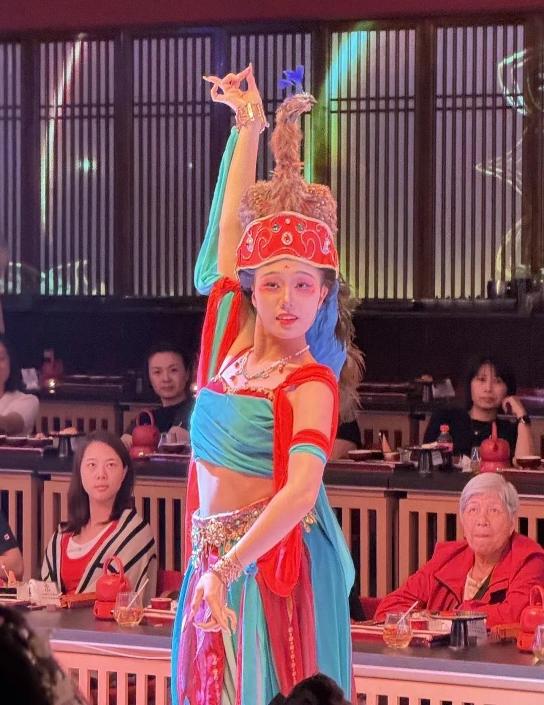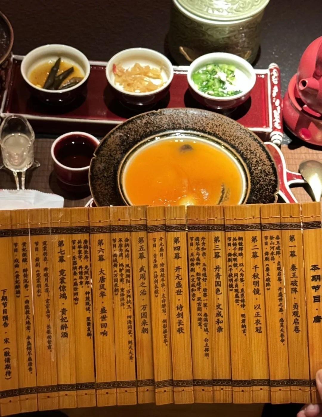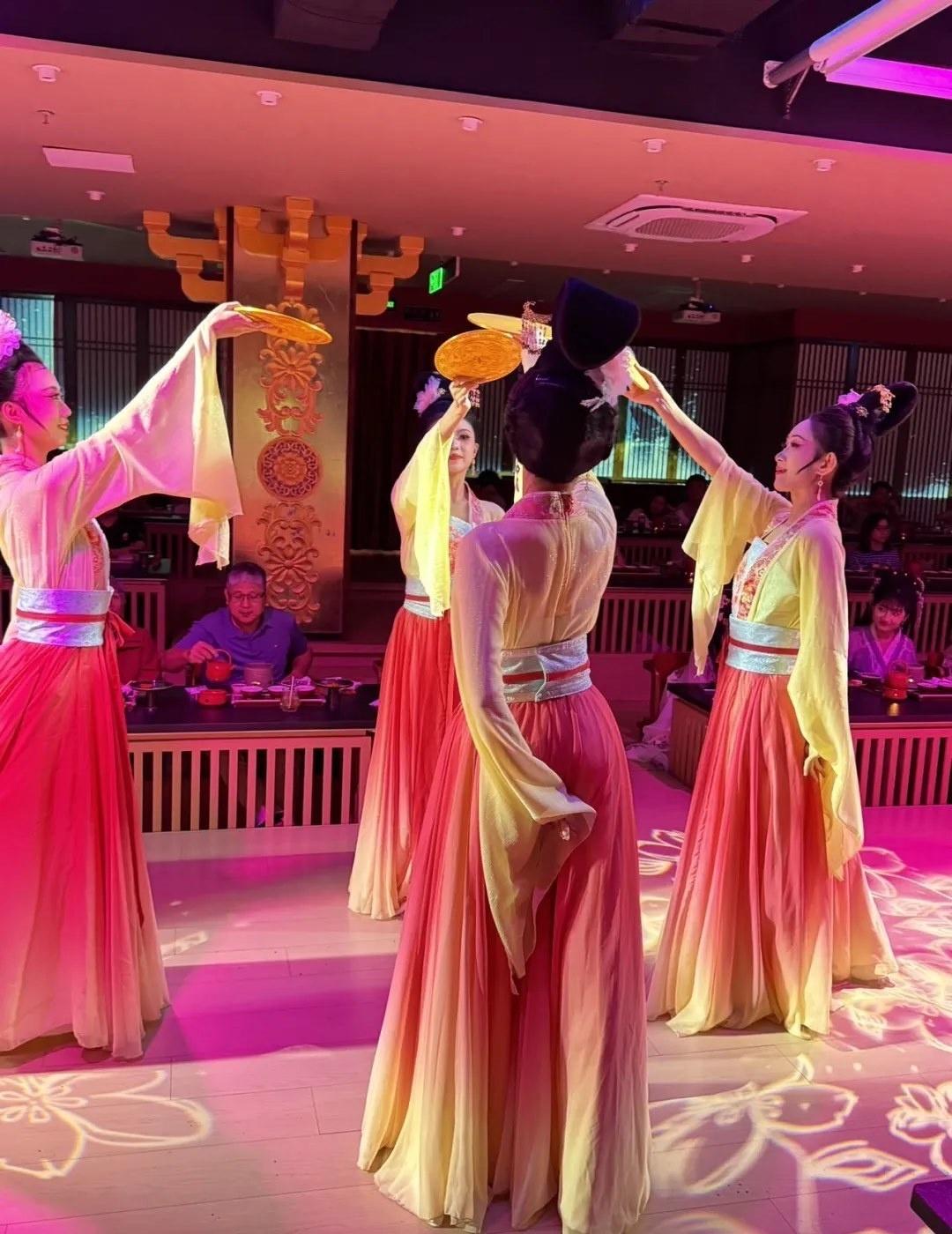 谁懂啊!在松江逛街被朋友拉进一家店,推开门直接懵了——满店的唐风装饰,连店员都穿得像从仕女图里走出来的,这哪是吃饭,明明是闯进了盛唐宫廷宴啊!✨ 进店第一要务必须是选汉服! 不是那种敷衍的款式,架子上挂满了精致的襦裙、披风,我一眼挑中了西域风的,花纹和配饰都超细节。化妆师小姐姐手也太巧了吧,花钿一贴、头饰一戴,对着镜子直接“哇塞”出声,随便找个角落拍拍也很出片哦!📸 宫廷美点三福 里面的贵妃虾滑荔枝真的绝了——外壳是清甜的荔枝味,咬开瞬间爆汁,虾滑的鲜裹着果香,这一口下去,终于懂了“一骑红尘妃子笑”的快乐,根本停不下来! 龙舌牛肉粒 直接戳中本帮胃!甜口的做法特别地道,肉质嫩到轻轻一嚼就化,甜而不腻,连吃三颗都没够,配米饭能炫半碗! 龙舸蒸黄鱼 端上来的时候还冒着热气,鱼肉剥下来是完整的蒜瓣状,入口超嫩滑,鲜味儿直往喉咙里窜,吃的时候连汤汁都想舔干净,鲜到眉毛都要飘走了~ [心]最绝的是边吃边能看表演!七幕剧轮番上,帅哥美女载歌载舞,有的讲丝路故事,有的演宫廷趣事,眼睛和嘴巴根本忙不过来,这顿饭吃得比看秀还过瘾🎭 现在已经开始盼着生日了——必须再来这儿过!想体验“穿越”的宝子听我的,这种神仙地方,真的会N刷! 🏡店名:盛宫宴(上海首店)