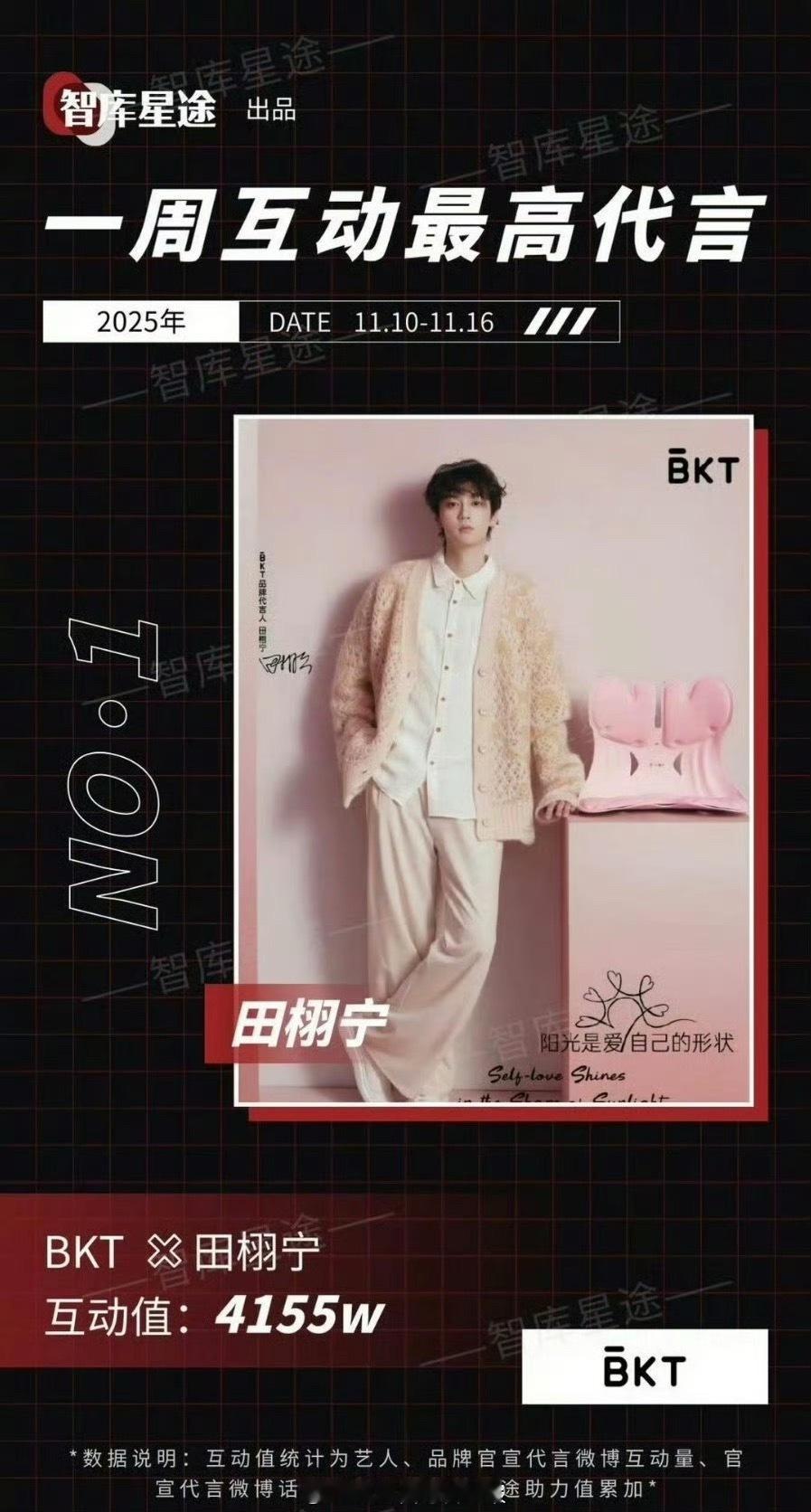 上周互动最高代言:田栩宁 BKT,不愧是内娱新晋顶流!