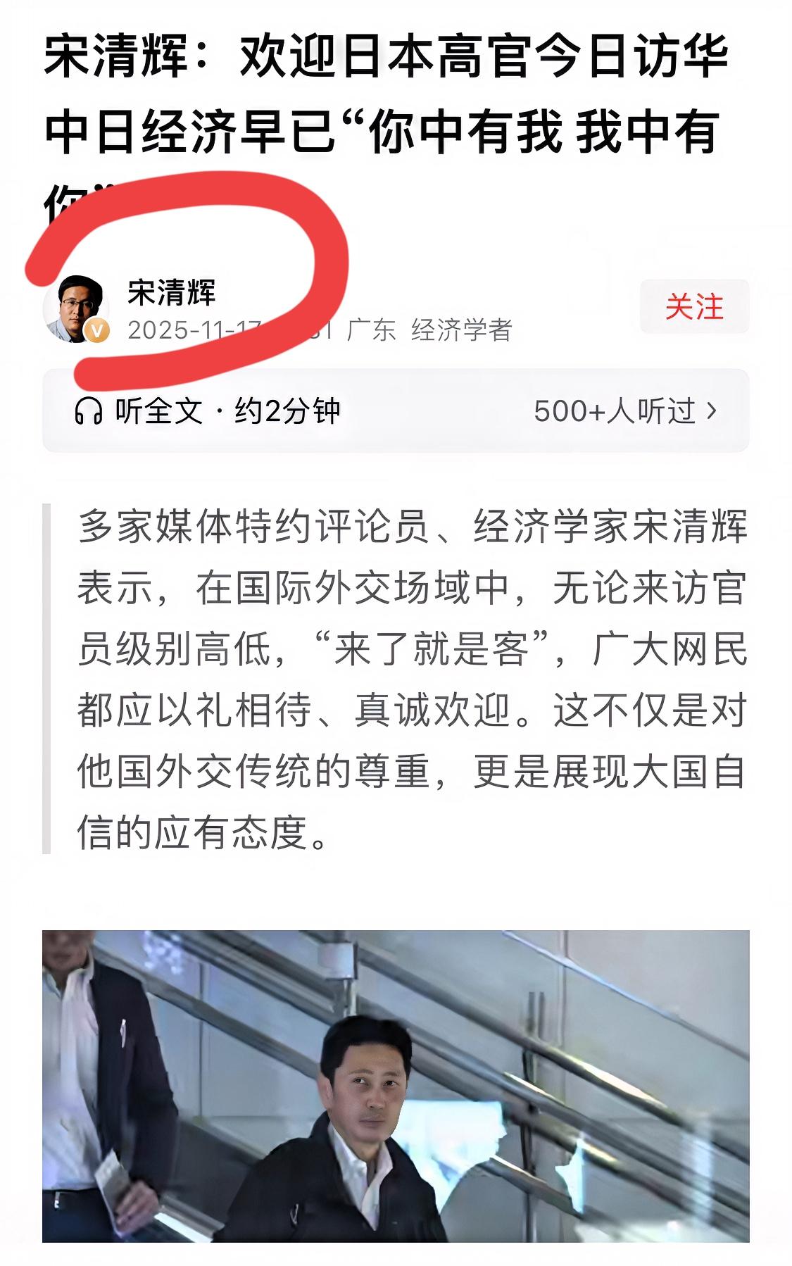 真搞不懂会有宋清辉这样的人存在,竟拿中日密切的经济关系给高小姐的严重挑衅言语变相洗地。 不否认中日间密切的经济联系,我们也会欢迎日方外务省亚洲大洋洲局局长金井正彰来华,但既然这样,为何不见宋大经济学家去批判日本首相高小姐这个破坏两国“友谊”的始作俑者呢?哪怕你提一句我都不认为你是在给日本洗地。 看看这位日外务省高管来华的目的,说明日本首相高市早苗近日的涉台发言并未改变日方一贯立场,同时传达“即便双方存在立场分歧,也应避免影响人员交流”的立场。 再看看日本自民党代理政策调查会长田村宪久在昨日一档节目中透露道,高市早苗正在反省其涉台言论,表示,“首相也在反省未能充分说明背景的问题,今后应该不会再有此类发言。” 怎么看都是扯淡,一个首相的言论可以代表不了日本民意,但至少代表了现在的政府。虽被透露在反思,结果就是至今并无要撤回狂妄言论的打算,也不保证下次还会不会继续说出类似言论。 要不是我们抱着最大善意以及提醒国人近期勿往日本影响了日本的旅游等收入,高小姐下面的人会来华“说明”?但即使这样也没反映出它们真认识到了错误。 农夫与蛇的故事,三岁孩童都知道,结果“宋大家”却装不懂。中日经济可以继续保持良好关系,但前提是至少高小姐郑重撤回之前言论和道歉,并保证之后不会再犯。任何利益都不该建立在国家主权和民族大义之上,美国对我们的经济更重要,但特朗普敢如此说话吗? 大国自信可不是被疯狗咬了还要以礼待之!何况这个世界真没了日本也不会对我们经济发展造成啥大困难。 总之,宋清辉之流真让人不适……