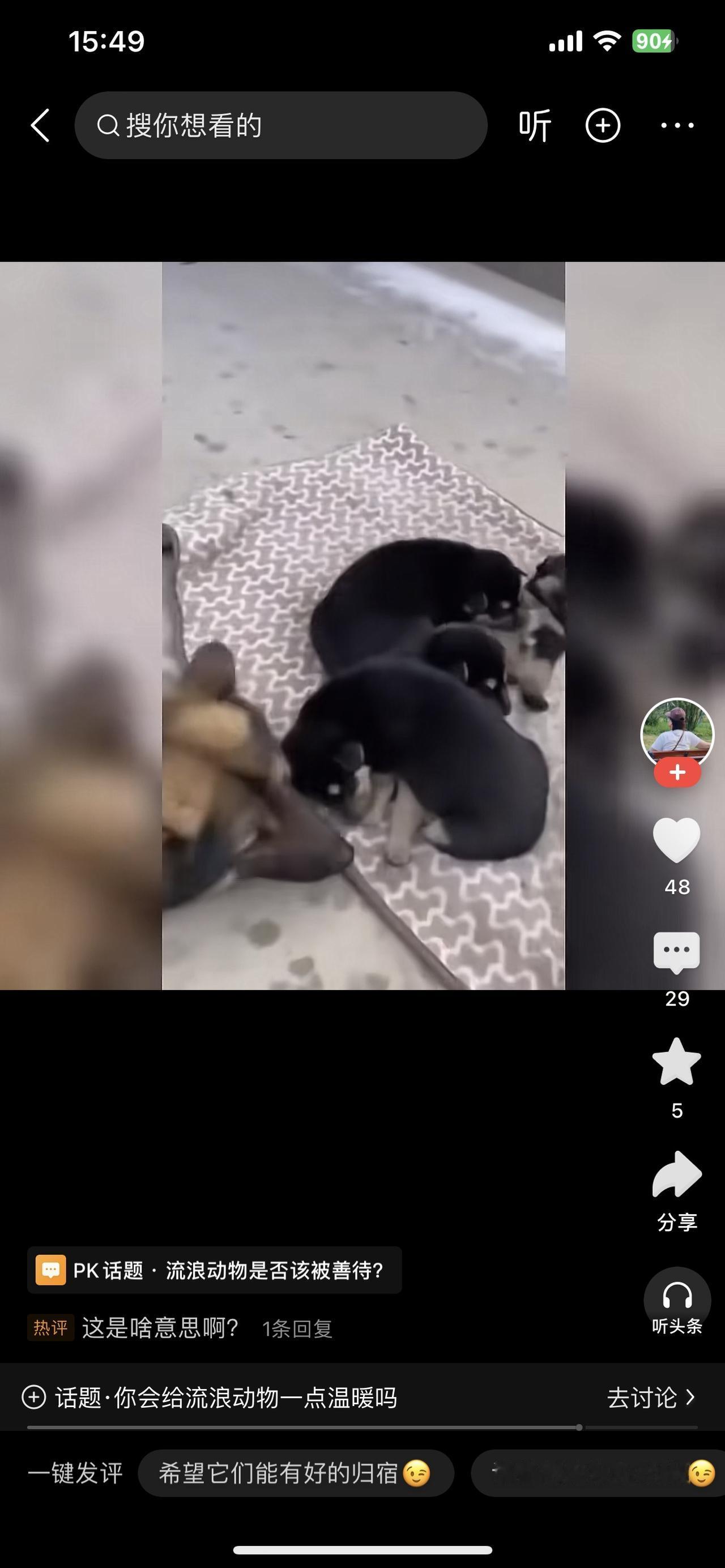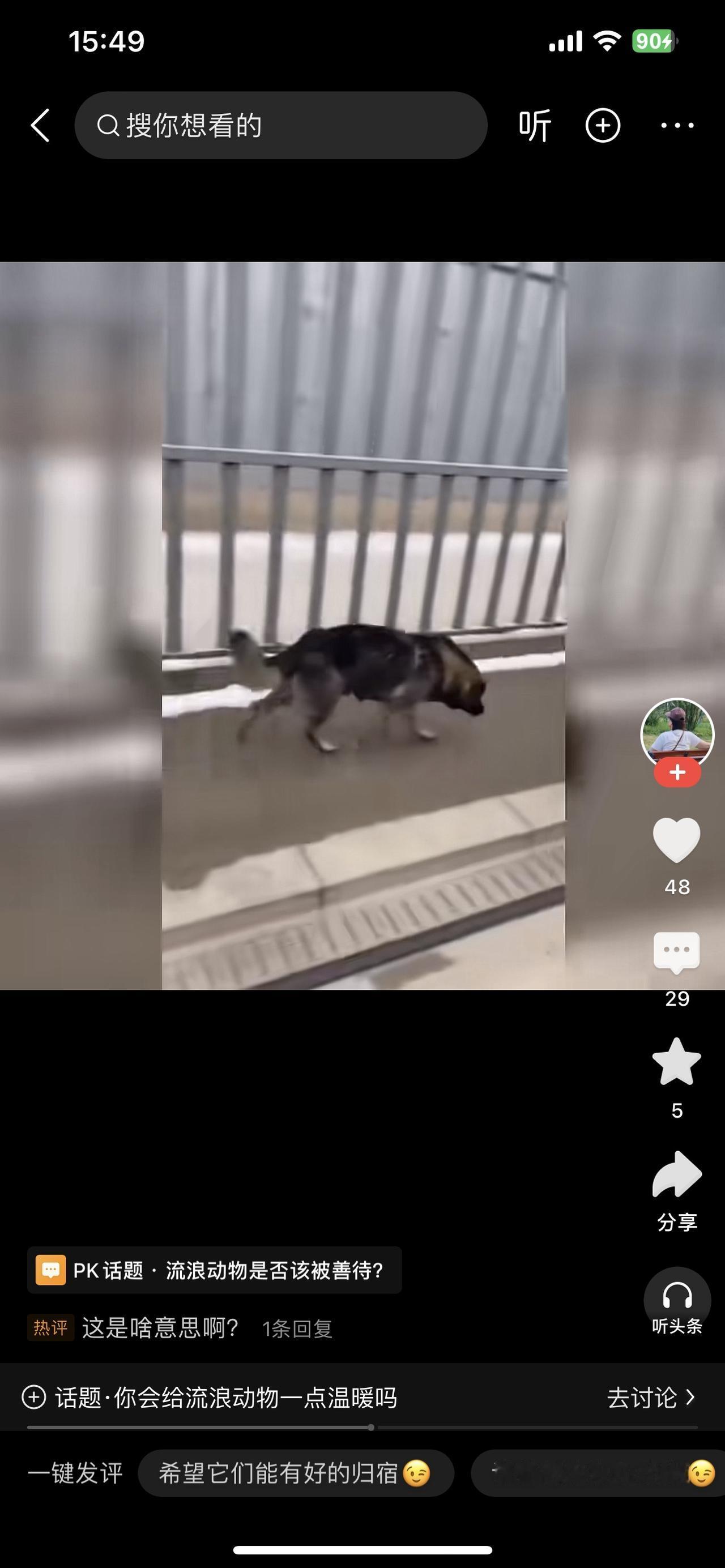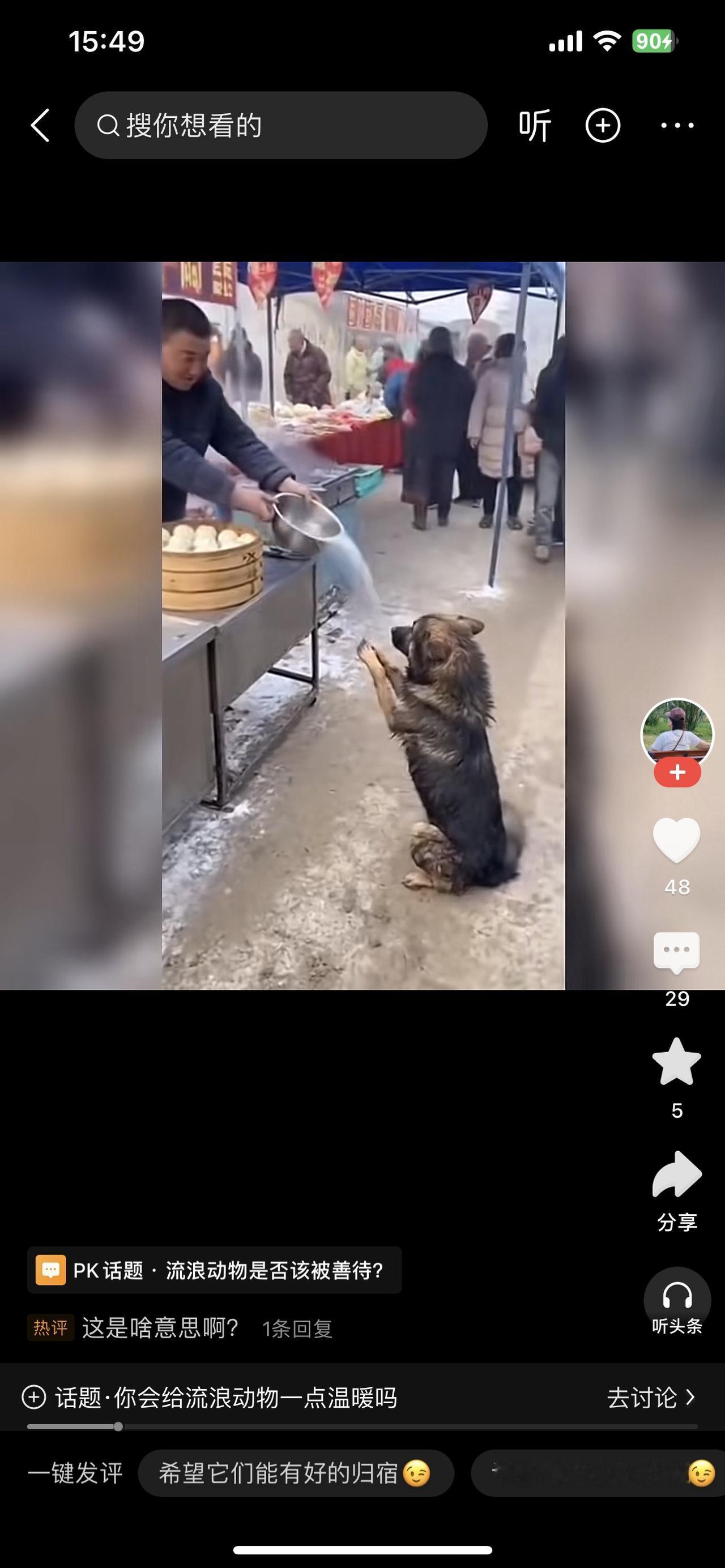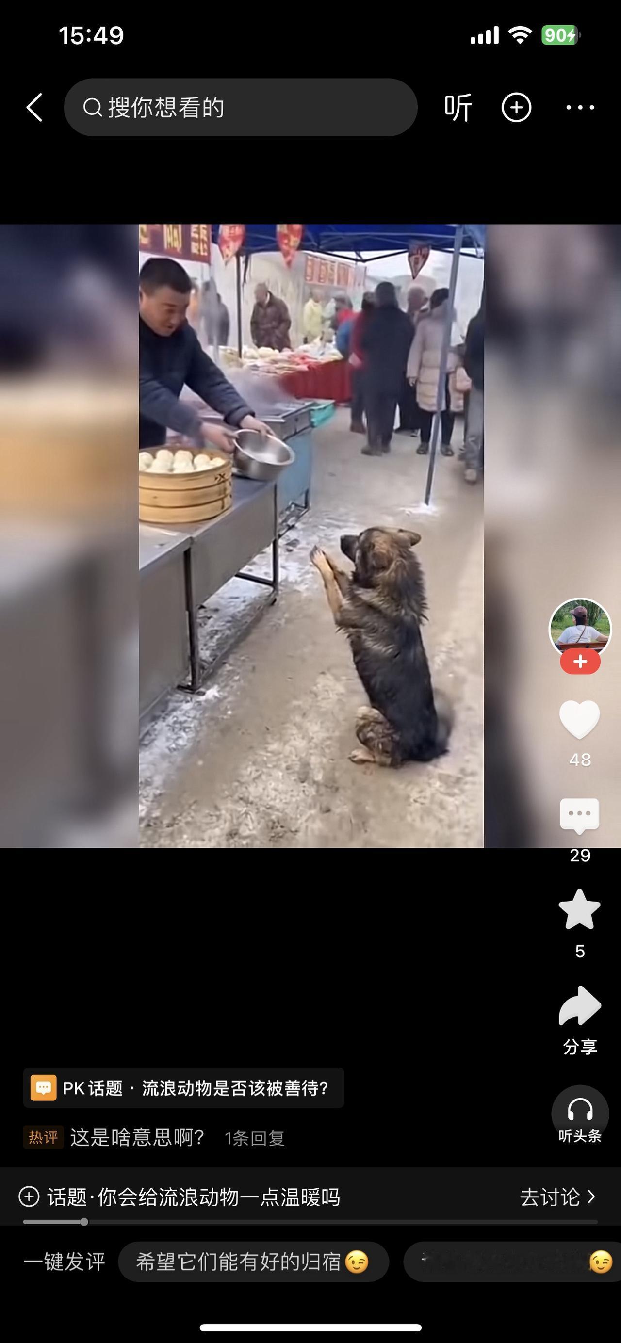 流浪动物是否该被善待? 集市包子摊的蒸汽裹着寒气,流浪狗蹲在摊边,前爪搭着腿站起来——它毛上沾着泥痂,尾巴夹得紧紧的,是想讨口热乎的,却没敢碰案板的笼屉。 摊主拎着热水壶转过身,“哗啦”一声把水泼在狗脚边。热水溅在它爪子上,狗嗷地缩了一下,慌得往后退,爪子在冻硬的地上扒出浅印,却没跑远。 旁边买菜的阿姨皱起眉:“你这是干啥?它又没惹你。”摊主擦着壶嘴:“脏东西凑过来,影响我卖货。” 狗蹲在离摊几米的墙根,蜷着身子舔爪子,舌头碰到烫红的地方,又疼得缩回来。过了会儿,它还是没走,盯着笼屉里的包子,喉咙里发出轻轻的呜咽。 等集市散了,它才颠颠地往巷口跑——那里的旧纸箱里,三只刚睁眼的小狗崽正挤在一块发抖,铺着的破布是前几天好心人扔的。它把叼来的凉馒头渣推到崽崽们跟前,自己舔了舔沾着灰的地面。 其实善待不用多费力,是别用热水泼,是别踹一脚,是哪怕递块凉馒头。这些小生命拼尽全力活着,不伤害,就是最大的温柔。流浪狗