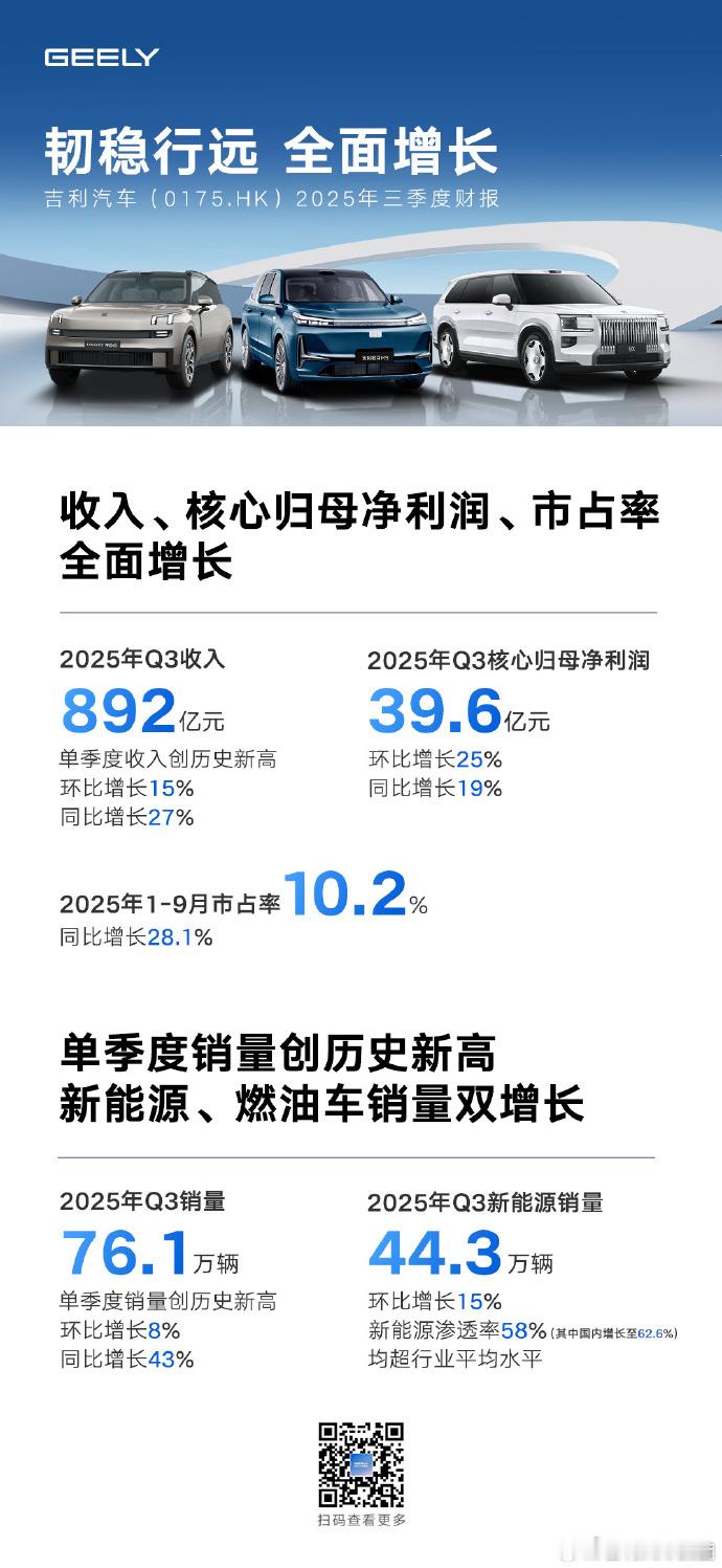 吉利汽车2025年三季度财报发布:收入、核心归母净利润双增长,收入892亿元创历史新高,单季度销量76.1万辆创历史新高。
