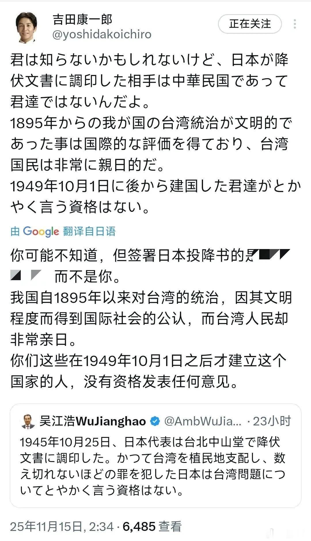 日本右翼议员:新中国没签投降文书,没资格发表意见 这次中日纷争,炸出来一堆日本政坛中的牛鬼蛇神。此前中国驻日大使曾提醒日方,不要忘记战败国的身份,以及曾经对中国台湾省的殖民统治。结果当地时间15日,日本右翼议员吉田康一郎在社媒上公然声称,日本对台湾省的殖民统治得到了国际公认,而新中国没有签署投降文书,所以没有资格发表意见。显然,这名右翼议员的话里有着两层意思:第一,为日本的殖民罪行洗地。所以他才能声称,当年日本的殖民统治受到所谓“国际公认”。他也不想想,他嘴里的所谓“国际”,正是当年瓜分中国的帝国主义殖民者,他是在“犯罪分子”中寻求认同。第二,为日本军国主义侵略战争洗白。看他的意思,日本发动战争并没有错,只是因为战败了,签了投降文书,如今才“低人一等”。显然,以他为代表的日本右翼们根本不是反战争,而是反战败,如果有机会,他们恐怕还会对外发动侵略战争。至于他说新中国没有签文书,这就是打算用旧中国来否定新中国,是妥妥的谬论。说白了,在日本人心中,谁把他们揍得狠,他们就服谁,否则,和俄罗斯人争南千岛群岛的时候,他们怎么不敢说那是苏联签的协议,俄罗斯没有权利继承?还不是因为80年前被俄罗斯人打怕了,知道俄罗斯人真会揍人?按他的理论,看来日本是需要再签一份对新中国的投降文书,才能真正认错。而照日本如今疯狂挑衅的样子,他们签投降文书的时刻,恐怕已经不远了。