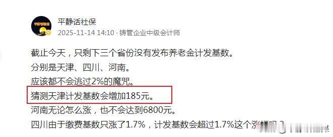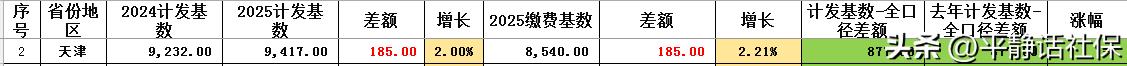 天津2025年计发基数果然是9417元! 天津人社官网发布2025年计发基数9417元,比2024年9232元增加185元,涨幅2%。 2025年缴费基数增长185元,涨幅2.21%。 保持了缴费基数与计发基数差额877元没有一丝变化! 这个数与前两天我猜的一模一样! 只剩河南、四川了!