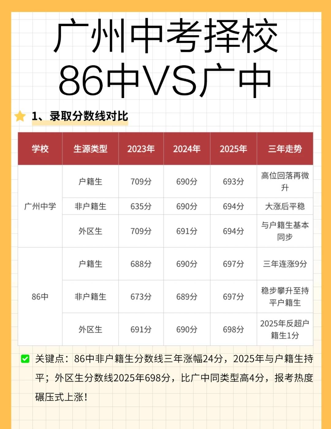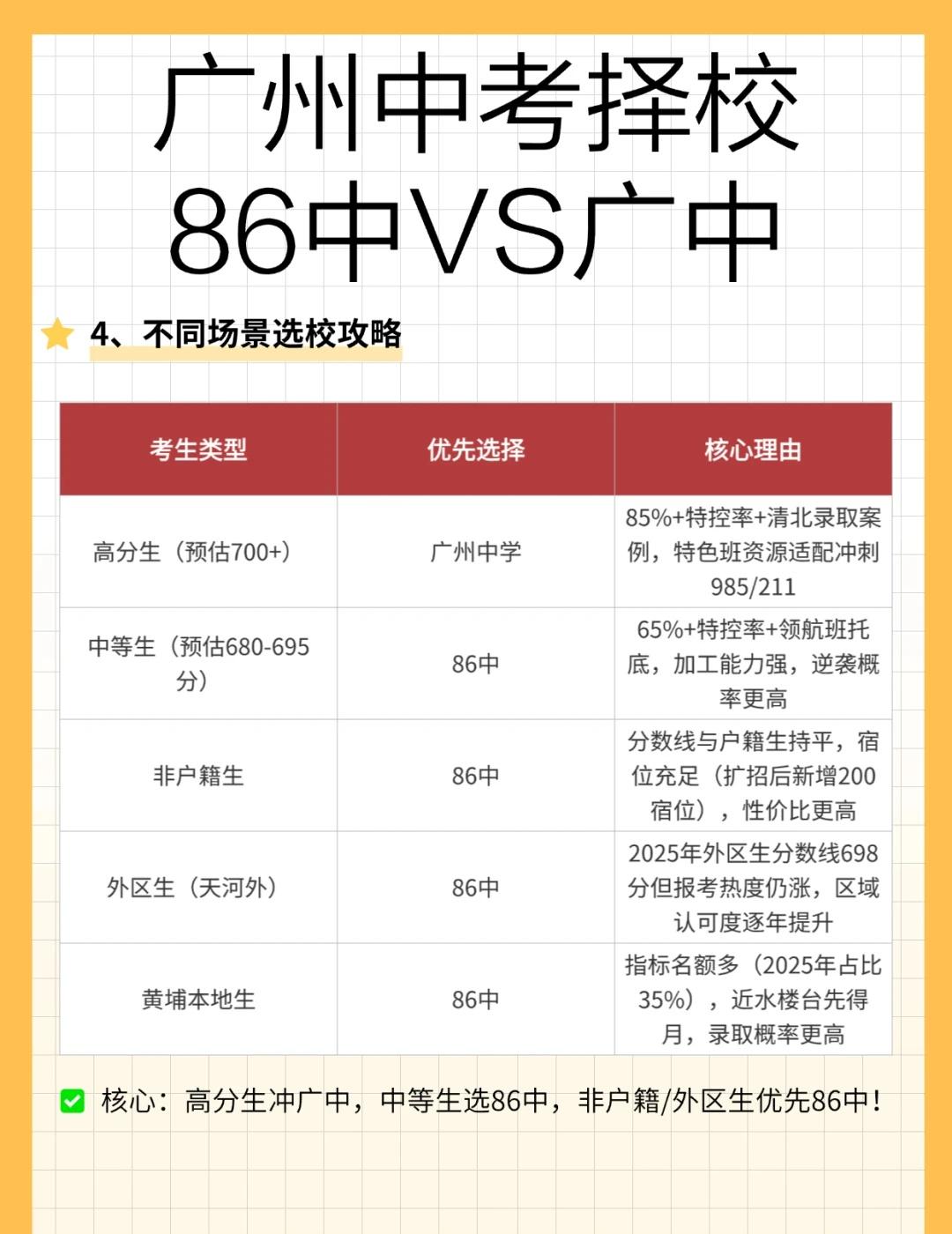 广州中考择校:86中VS广中,选对学校不踩坑 广州中考家长必看!纠结广州中学和86中的,三类生源分数线+高考战绩拆解,让你知道自己更适合哪个学校,选校不迷路! 核心结论:高分生冲广中,中等生选86中,非户籍/外区生优先86中!广州中考 择校 广州高中 中考志愿填报 广州市第八十六中 广州中学 广州升学 中考 升学规划