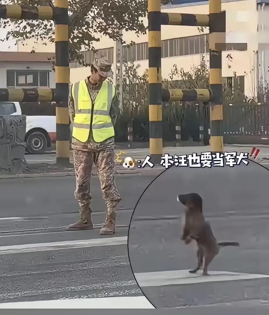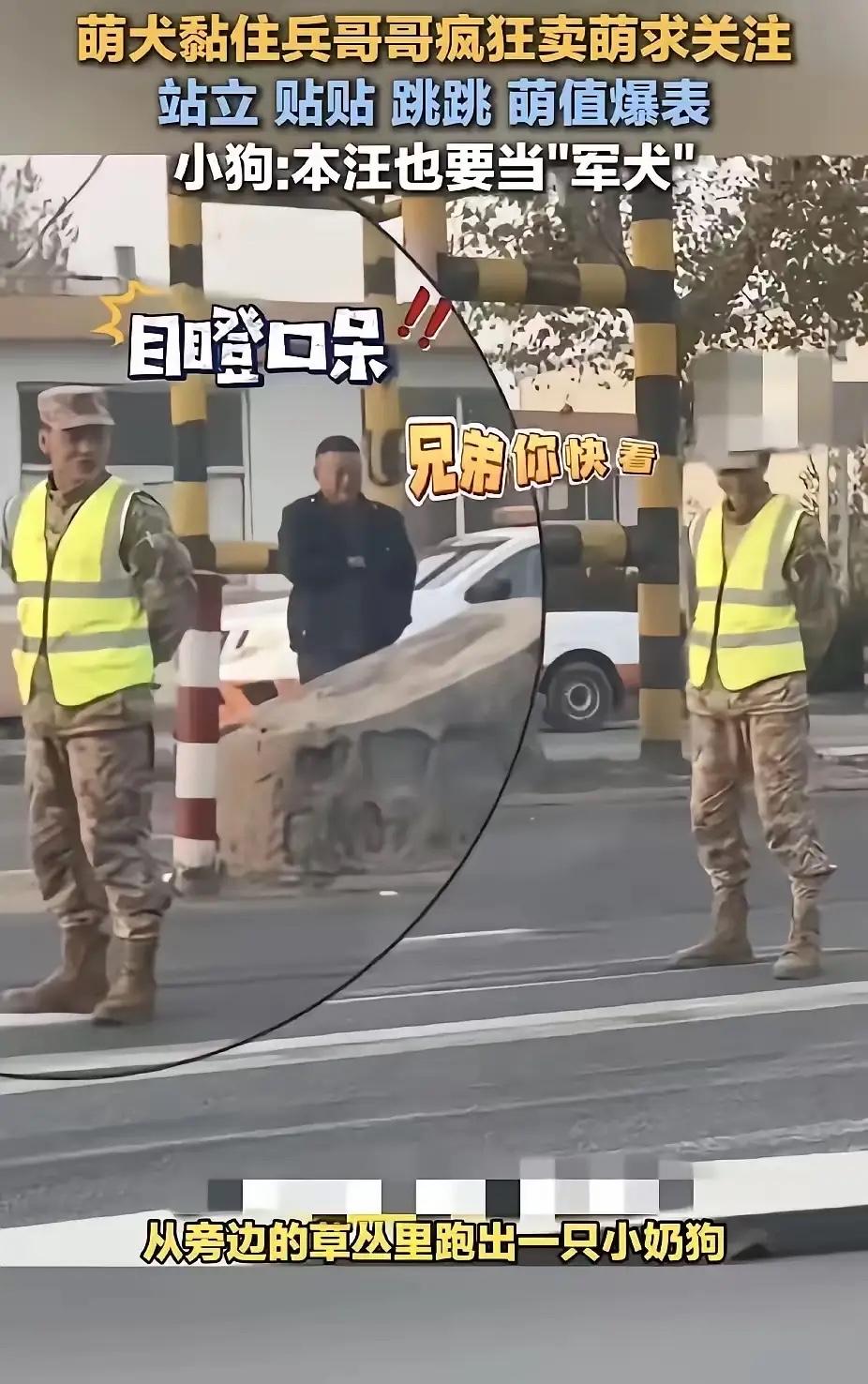 太萌了!一位兵哥哥正在巡查,结果从旁边草丛里跑来一只流浪狗,在他面前做起就表演,