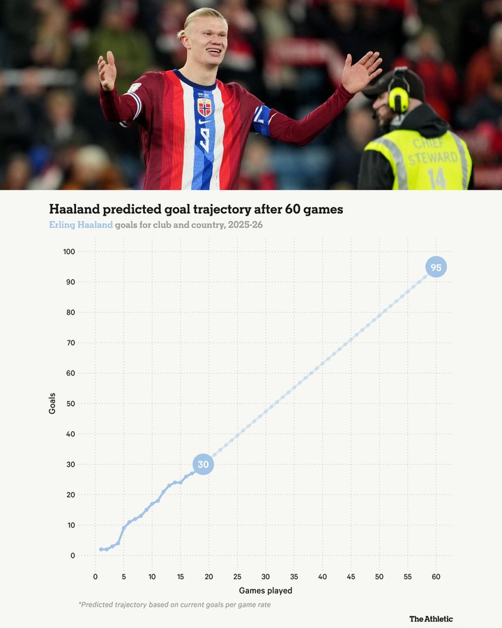世界杯进球应该要下降了,挪威这种全靠大腿爆发的队后面容易卡壳,不过已经很厉害了,欧冠多走走60球应该是有的
