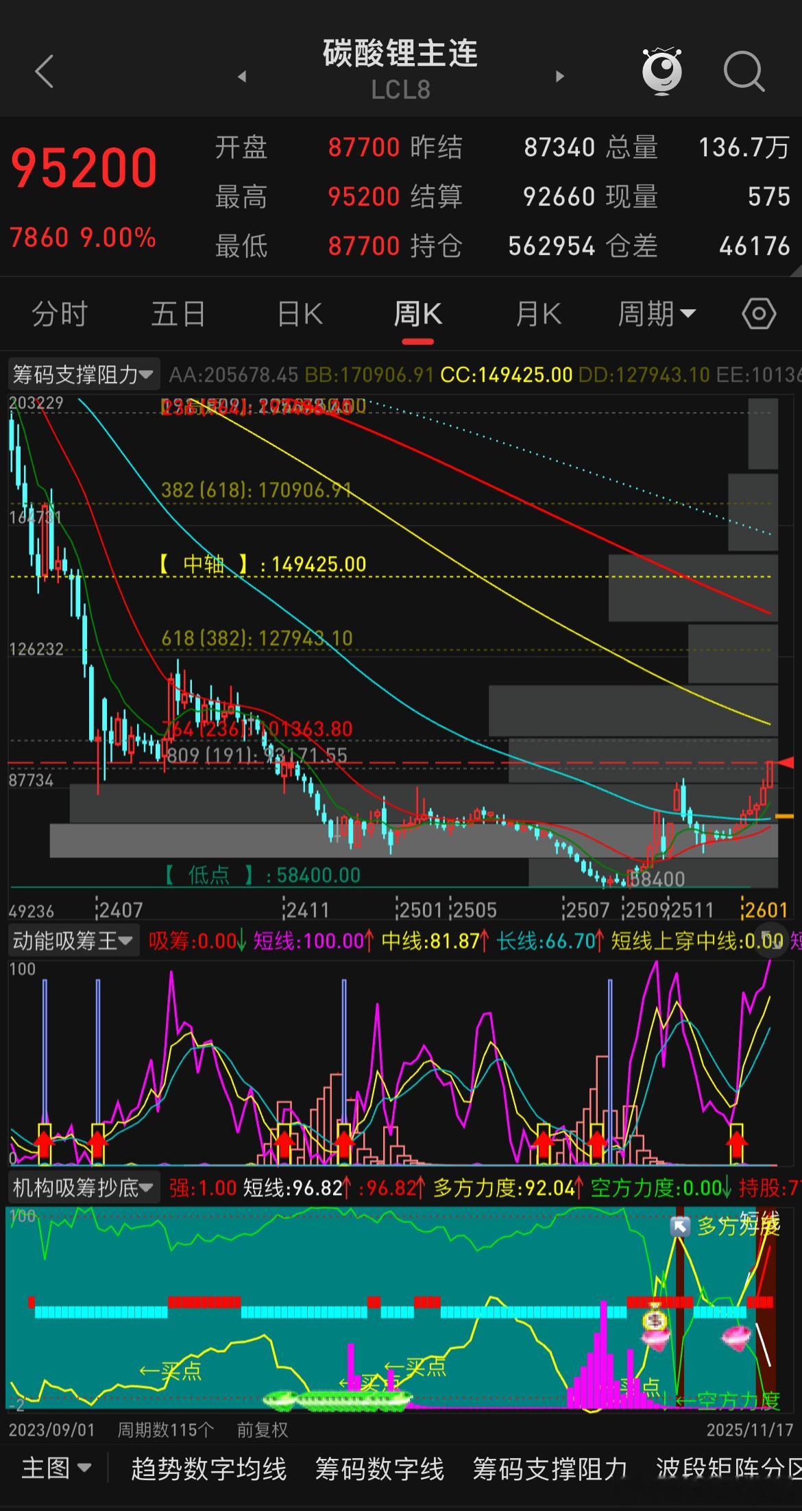 今日商品市场最靓的仔无疑是碳酸锂,尾盘拉了涨停,做到了的朋友为他们鼓掌,没做到的不必可惜。首先这个品种自带妖性,不太适合一般散户操作,不要只看到行情好,风险也要顾及,市场不乏一部分朋友持有高空仓单,并不是都是多头仓单,也不存在都吃到了涨停,所以你没做,当然这波涨停不会有利润,但也不会亏钱。看不懂的品种还是劝诫大家不要去碰,类似碳酸锂这样的品种很多,一般散户亏钱就亏在这些品种上,品种规律性偏差,易受消息影响,老手都把握不住的品种,新手看看就好,不要去凑这个热闹。目前碳酸锂市场在炒上10万的预期,至于会不会到,看资金情绪是否一直保持高涨,我是看不懂碳酸锂,也没仓位,目的是劝诫大家注意下风险,自带妖性的品种少放仓位,把仓位放在该放的稳健品种上。