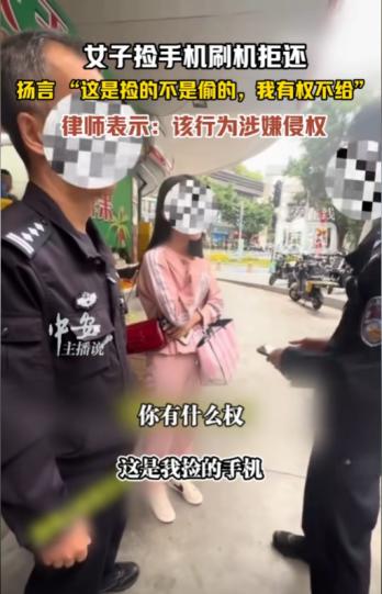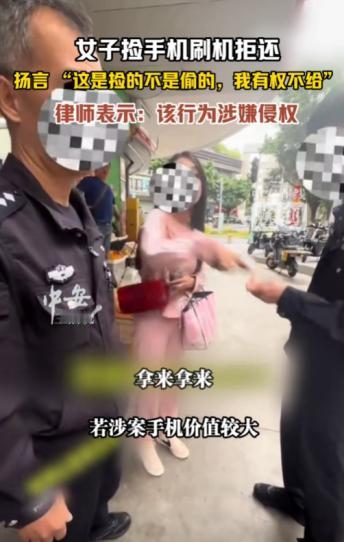 “离了个大谱!”广东广州,一女子外出捡到一台手机,很快失主就打来电话,没想到该女子竟直接挂断电话,而且还跑到网吧刷机,想要据为己有!警察和失主找到她时,女子不但不归还,还一把将手机从民警手里夺过来,并嚣张表示自己捡到的有权不还,网友:想钱想疯了! 面对意外获得的财富,有人拾金不昧,主动归还失主;也有人财迷心窍,即便在警察与失主一同上门的情况下,仍拒绝交出,最终因一时贪念,让自己背负了不必要的法律责任。 11月11日,一女子发现一部手机,看见失主打过来的电话寥寥数语便挂断,之后拨打该女子一律不接。 失主无奈只能报警,当警方与失主通过手机定位找到她时,发现该女子在网吧正在对手机进行刷机,想要将手机信息全部抹除。 看到这一幕失主十分气愤,质问女子为什么不接电话也不归还手机,该女子被抓现行也丝毫不慌,表示是自己捡到的又不是偷的,还让失主态度放轻松。 当民警明确告诉她的行为违法时,她竟然理直气壮的说自己捡到的东西,有权利给与不给,听得失主气不打一处来,随即表示会起诉她,没想到该女子听后一把将手机从民警手里夺过来,态度恶劣地让失主随便起诉! 网友看后表示,不要把无知当底气,既然踩中了法律的红线,那就让她付出相应的代价! 信息来源:《女子捡手机刷机拒还,扬言“捡的不是偷的,我有权不给”,律师表示:该行为涉嫌侵权》中安在线