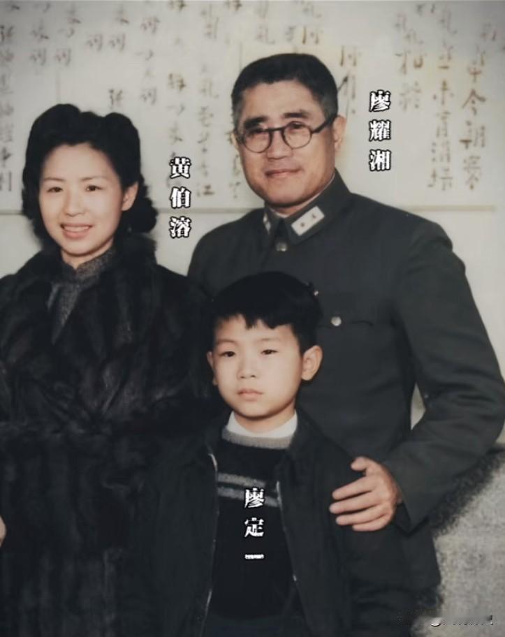 这张珍贵合影拍摄于1945年 1945年抗战胜利后,抗日名将廖耀湘终于和妻子儿子团聚了,他们一起留下这张珍贵合影! 在1934年,廖耀湘留学法国,在圣西尔军校学习,然后经过朋友介绍认识了身在异乡的黄伯溶,当时的黄伯溶身为同盟会元老黄兴的侄女,也在法国留学,因为是同乡, 又都在法国留学,所以一见如故! 在1934年在法国结婚,第二年他们的儿子廖定一出生了,一家三口在法国生活,但好景不长,1937年抗战爆发,廖耀湘奉命回国参战,然后夫妻就分开了,直到1945年抗战胜利,他们一家三口才得以团聚,并留下这张珍贵合影!