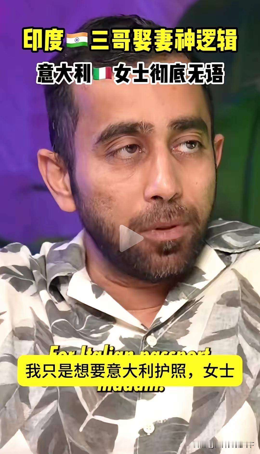 印度小伙直言,为拿意大利护照才娶意大利女孩,让女士直接无语。 你说你缺德冒烟就算了,还直言不讳,简直就是杀人诛心嘛[捂脸] 姑娘,看到没有,你跟三哥谈感情,三哥跟你玩心机。 我们国家的女生们,好好看看吧,这就是高质量的印度男性,好好看清楚,你们作何感想啊? 印度小伙 印度男士