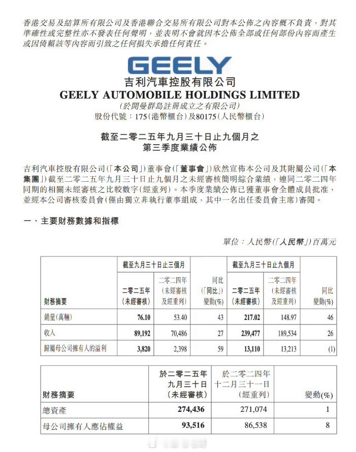 吉利发布了2025年Q3财报。- 三季度营收892亿元,同比增长27%,单季收入创历史新高;核心归母净利润39.6亿元,同比增长19%。- 前三季度销量217.02万辆,同比增长46%;三季度销量76.1万辆,创历史新高;出海方面,三季度出口了11.2万辆,环比增长19%。- 截至10月底销量247.7万辆,全年300万辆的目标完成率也来到了82.6%,今年四季度新车很多,而且最近两个月也是27.3万、30.7万辆,达成300万辆的目标基本是没啥问题了。