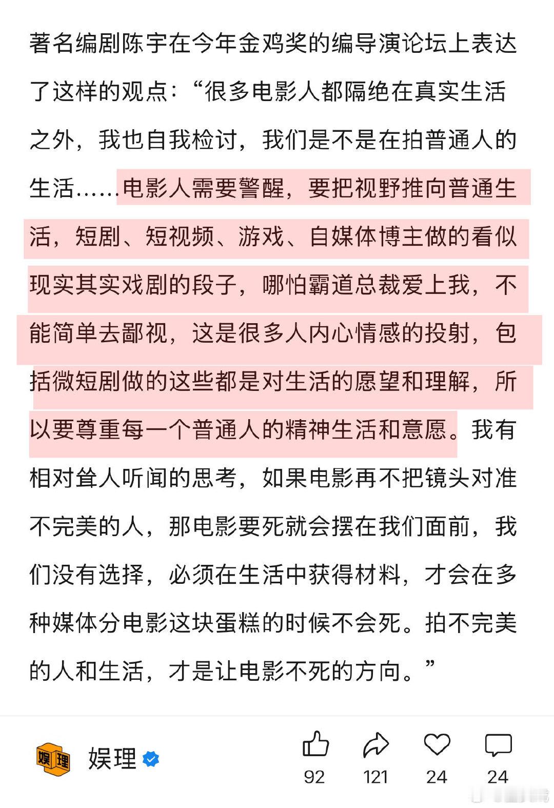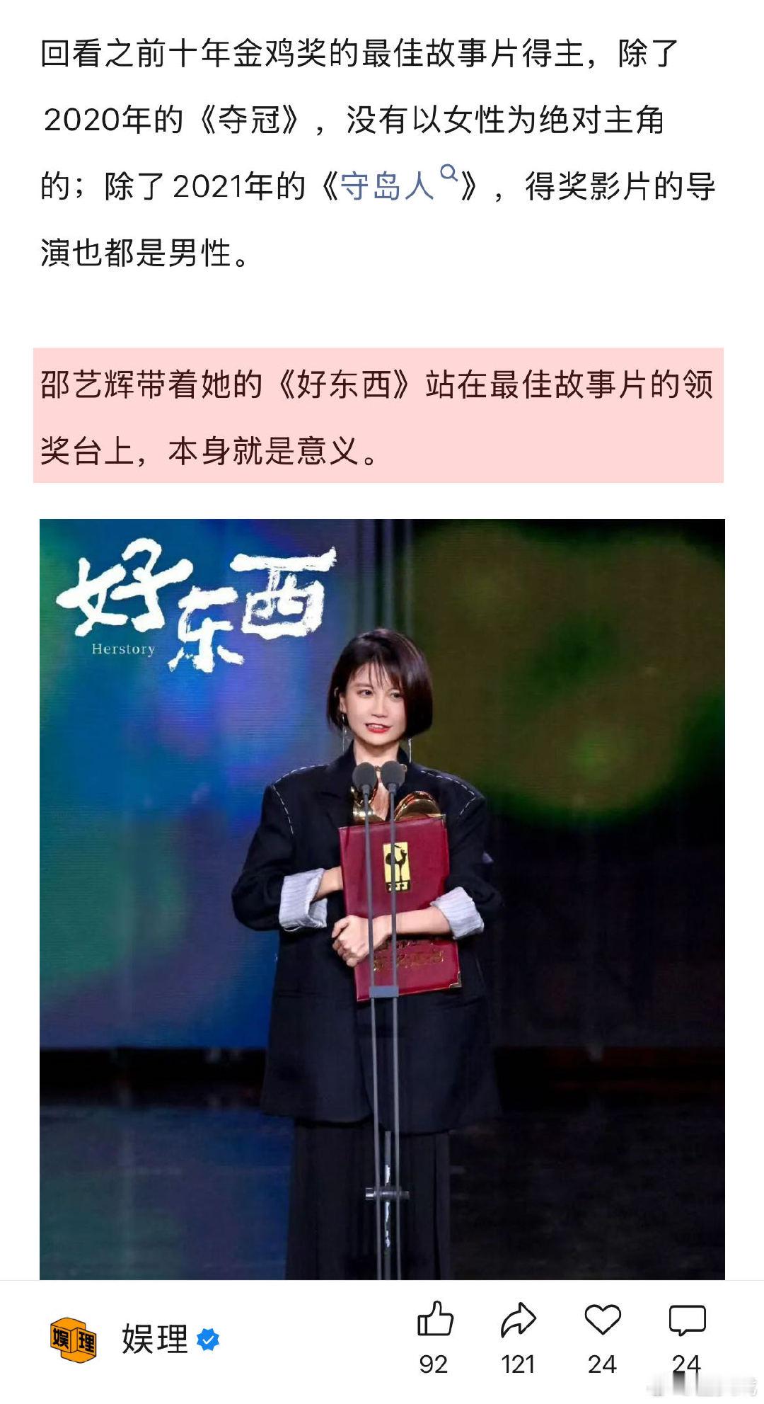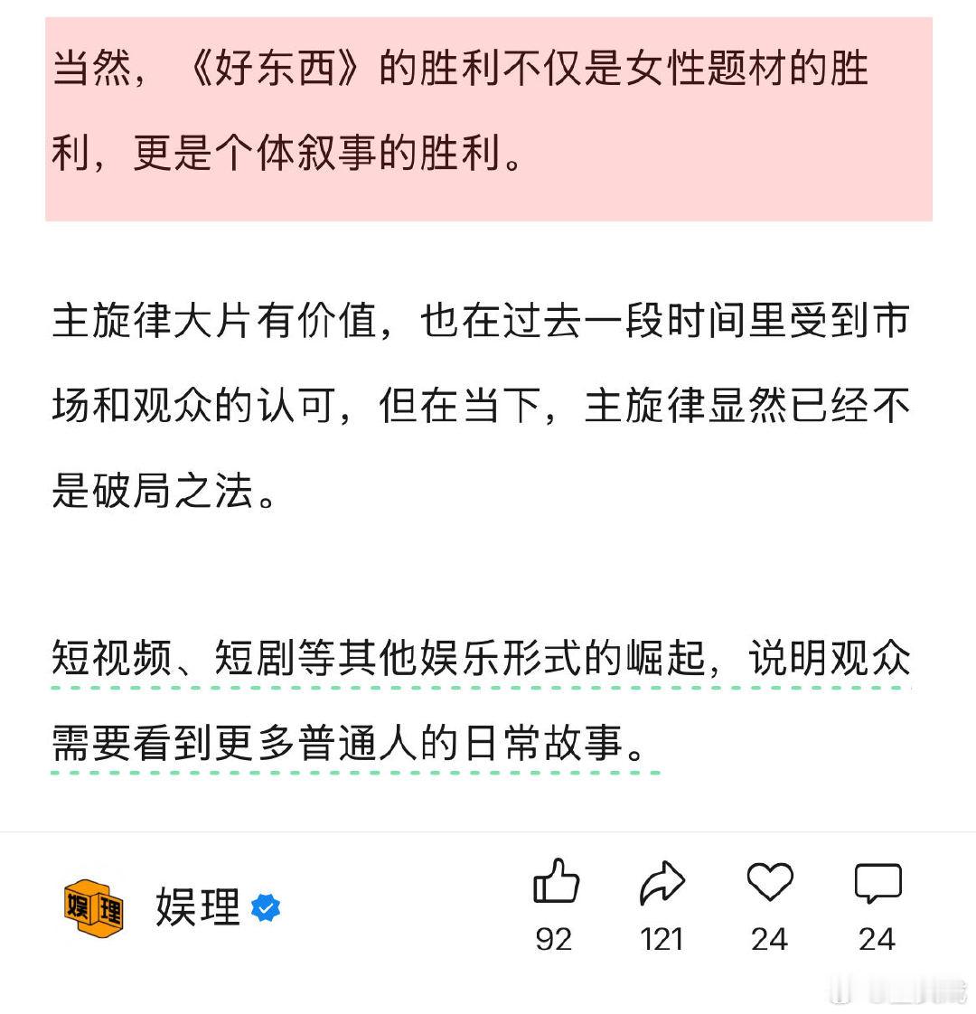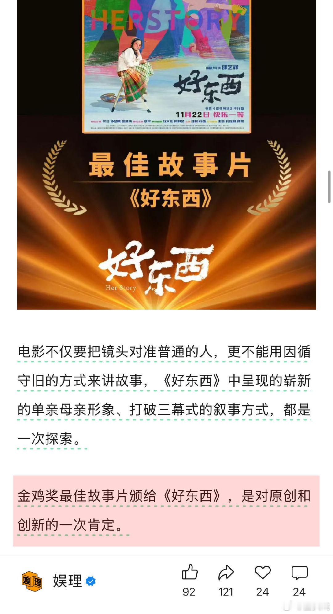 《好东西》的胜利不仅是女性题材的胜利,更是个体叙事的胜利。主旋律大片有价值,但在当下显然已经不是破局之法。短视频、短剧等其他娱乐形式的崛起,说明观众需要看到更多普通人的日常故事。金鸡奖最佳故事片颁给《好东西》,是对原创和创新的一次肯定…↓