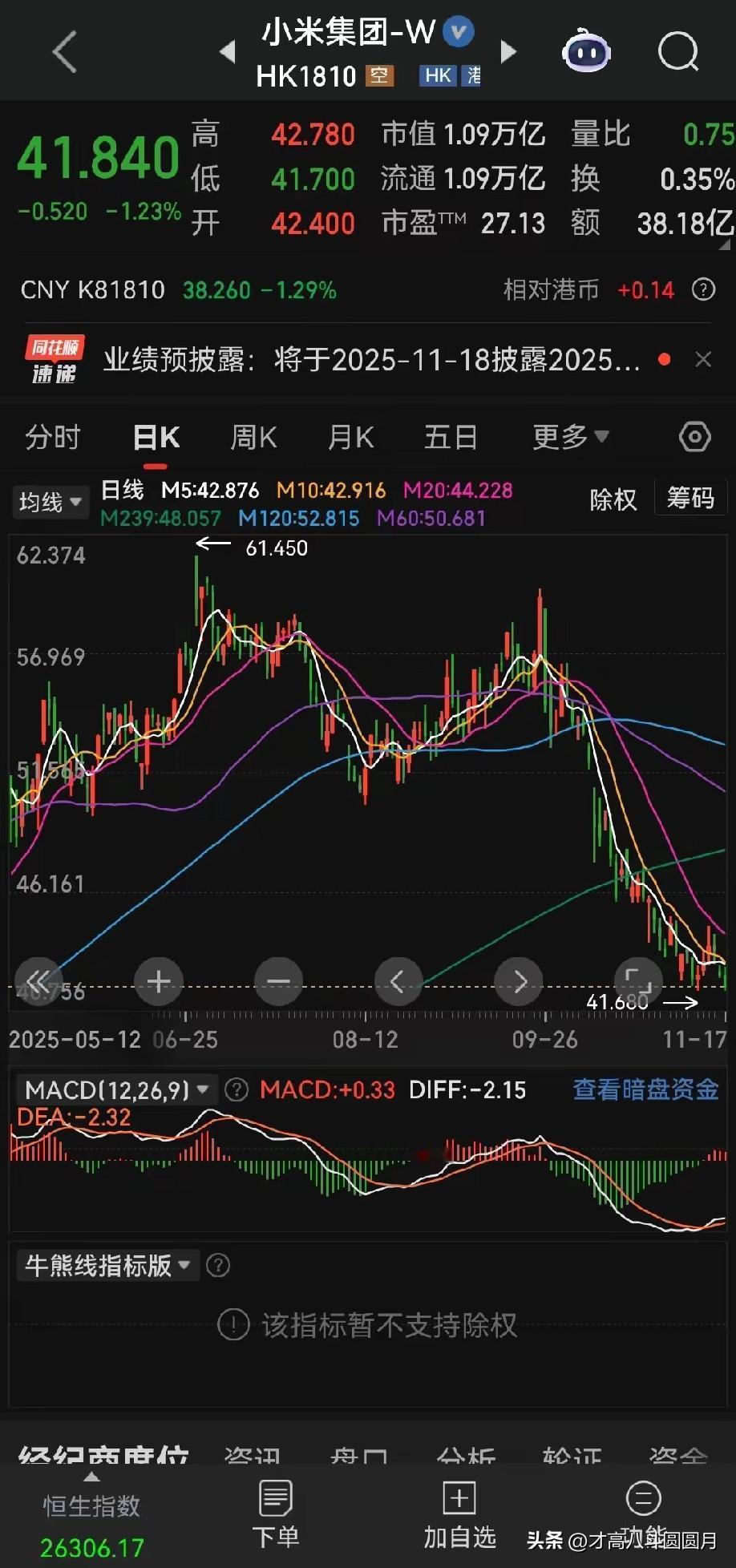 我有预感,小米这次真的要变天了!因为这次事件最大的影响,不是股价的短期波动,也不是投资者的恐慌情绪,而是市场对小米长期增长逻辑的重新审视。 小米集团股价从7月份的61港元左右跌至目前的41港元附近,回调幅度约33%。这种下跌让人联想到2008年巴菲特投资比亚迪后的情况,当时比亚迪股价从8港元涨到88港元,次年又回调至16港元。但小米与比亚迪的类比可能并不完全适用。比亚迪当时处于新能源汽车的早期风口,而小米现在面临的是智能手机市场的饱和以及汽车业务的巨额投入。小米汽车在2023年发布后,虽然引发关注,但量产和盈利仍需时间验证。 我自己观察,小米的挑战在于业务多元化带来的资金压力。智能手机收入占比仍然很高,但全球需求放缓。汽车领域竞争激烈,特斯拉和比亚迪已经占据先机。小米需要平衡创新和现金流,这可能影响短期股价。股价回调或许不是坏事,它迫使公司聚焦核心竞争力。但过度下跌会削弱融资能力,形成恶性循环。 小米创始人雷军曾强调长期主义,但资本市场往往缺乏耐心。这次下跌可能促使管理层加速改革,比如优化成本或寻找新增长点。投资者需要关注下一季财报,尤其是汽车部门的进展。如果小米能证明其转型可行性,股价有望回升。否则,变天可能成为新常态。晒图笔记大赛