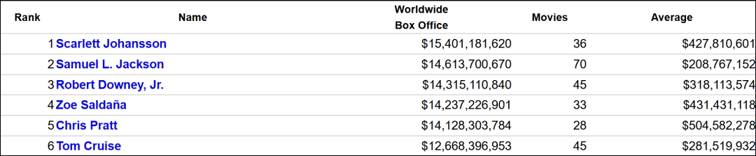 今年7月,据电影数据网站TheNumber的统计数据,阿汤哥在全球票房最高的演员中排行榜第6,仅次于“寡姐”斯嘉丽·约翰逊(ScarlettJohansson)、塞缪尔·L·杰克逊(SamuelL.Jackson)、小罗伯特·唐尼(RobertDowneyJr.)等经常出演漫威电影的好莱坞演员。