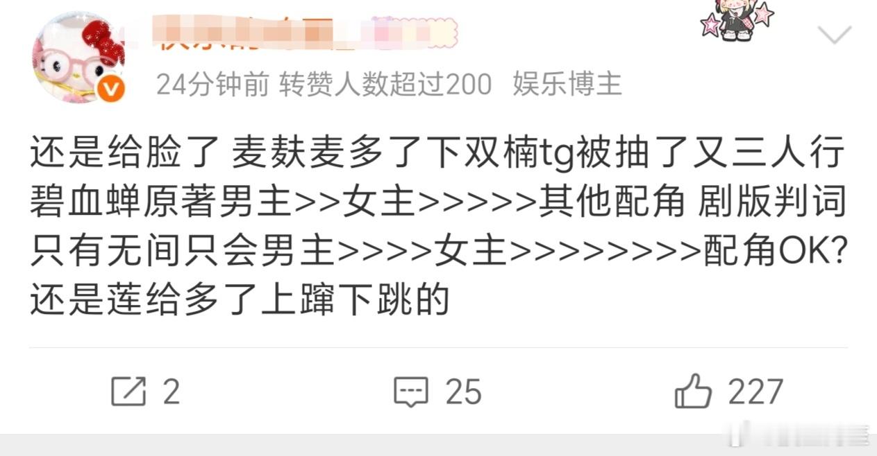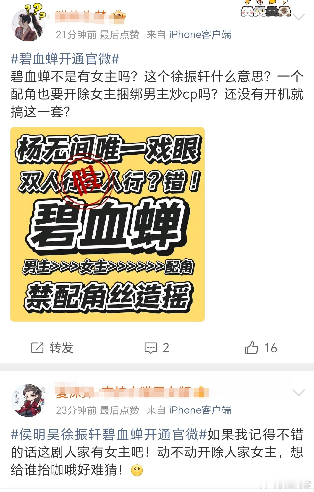 侯明昊粉丝在要求剧组表明碧血蝉是有女主的,明确男女主番位,同时明确徐振轩只是男配角。