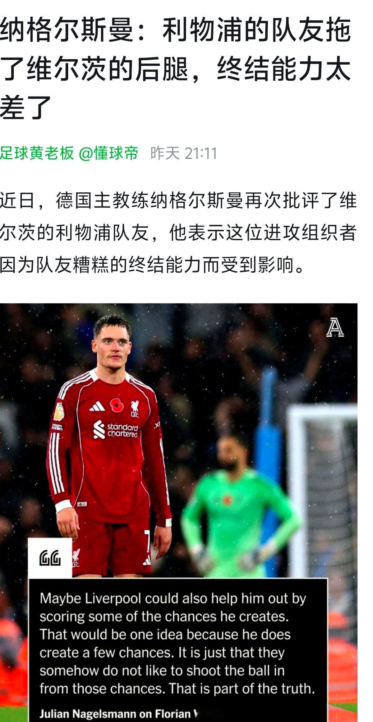 最近传维尔茨要去利物浦?其实根本没谱。勒沃库森喊价1亿,球员想留到2025年,除非解约条款触发才可能走。利物浦现在优先补中卫和后腰,前场不在计划里。 维尔茨在勒沃库森能拿18球19助,靠的是稳定进攻体系。可利物浦锋线拉胯:努涅斯射门转化率才12%,萨拉赫从前23%降到17%,全队关键传球比上赛季少14%。纳格尔斯曼都说他需要明确战术核心的队。 短期看,维尔茨要么留队,要么去拜仁曼城这种匹配的队,利物浦暂时别想了。