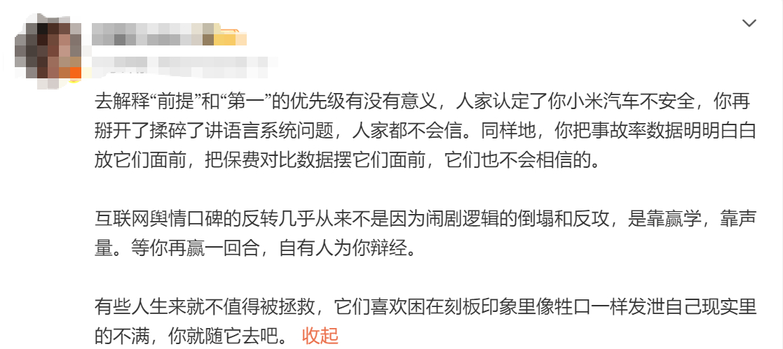 把希望寄托于别人自带干粮为你辨经,还不如修好内功,主动作为,谣言的存在就是因为存在信息差,如果你都放弃为自己辩护,那么路人只会认为你心虚。不是和散播谣言者争高低,而是尽可能的让更多普通人明白真相,拉回更多的将要被洗脑的人,不作为只会把这部分人推向谣言的陷阱,具备独立思考能力的人,可以走出陷阱,不能独立思考的人,就容易陷进去。相信逐渐消除信息差,会有越来越多的人重新认识小米,让散播谣言者无功而返或者承担更大的代价。