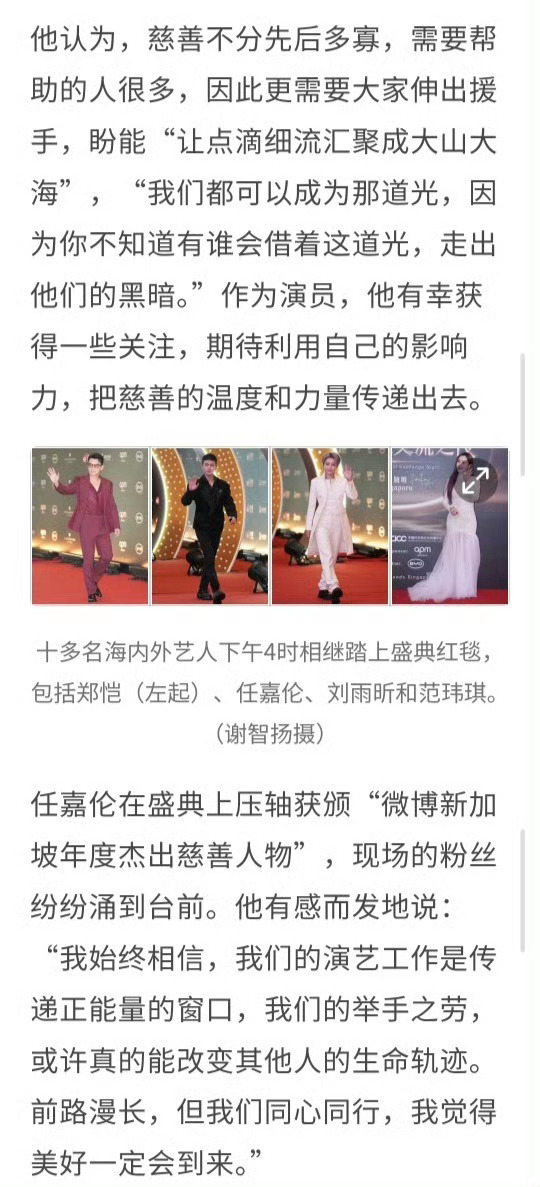 新加坡权威华文媒体联合早报报道:任嘉伦在盛典上压轴获颁“微博新加坡年度杰出慈善人物”