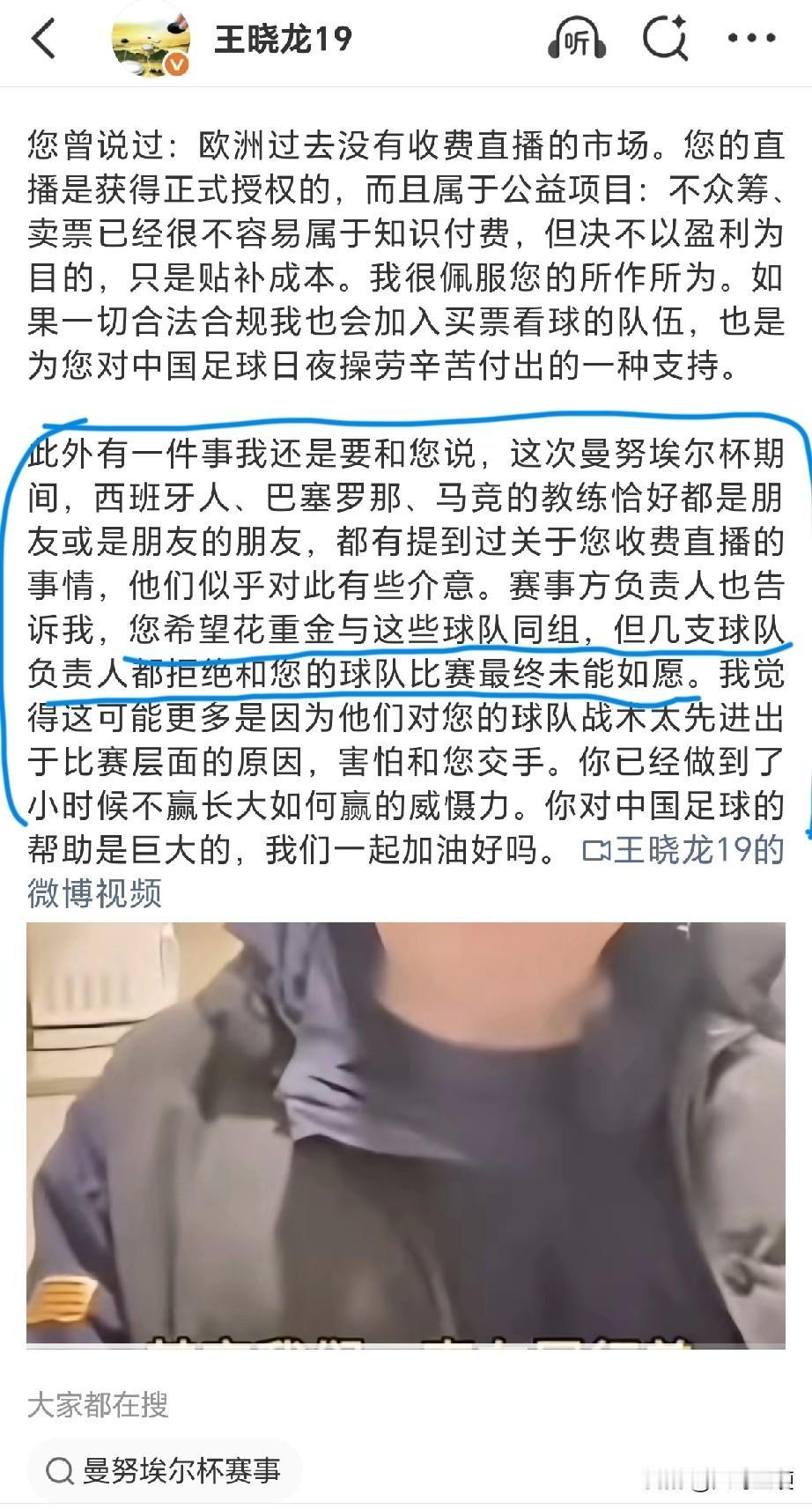 继黄健翔之后!前国脚王晓龙硬杠董路!誓要打破西班牙小镇嘉年华比赛信息差,这下就看董路敢不敢接招了[加油] 北京时间11月17日,前国脚王晓龙在其个人社交媒体上发文并配上视频,剑指董路足球小将去西班牙比赛直播的核心问题,还@了一下董路本人[奋斗] 王晓龙在文中,向董路提出了如下几个核心问题: 一、关于参加曼努埃尔杯的费用差价问题 王晓龙表示,本次他组队参加曼努埃尔杯,一周吃住费用+往返机票,人均总成本在8000 元左右。如果选择住民宿、自己做饭,开销还会更低…… 王晓龙发问董路,为何他的22 人团队(15个孩子+7个大人),即便不计算机票,整体费用应该在11万左右,为什么最终成本会变成30万?为何会出现这么大的差价[呆无辜] 二、关于直播曼努埃尔杯的版权问题 本次曼努埃尔杯,身在西班牙的王晓龙,先后主动联系了曼努埃尔杯赛事组委会、俱乐部的负责人、甚至联系到了加泰足协,结果得到的答复是,对方明确表示不会讨论任何直播或转播事宜,收费直播更是完全触碰不到,而且为了谨慎起见,王晓龙还特意咨询了西班牙律师朋友,他也明确答复,西班牙当地法律对此非常严格,风险极高,不可能随便操作[恐惧] 而董路在此前的直播中曾表示,他只花了500欧就拿到赛事直播版权[钱] 王晓龙对董路是如何获取赛事直播版权表示好奇和钦佩,并想先看看董路从俱乐部或赛事方获得直播版权的授权文件,更想确认其授权的合法性以及来源[得意] 最后,王晓龙还告诉董路一件事儿,本次曼努埃尔杯期间,西班牙人、巴塞罗那、马竞的教练,恰好都是王晓龙的朋友或是王晓龙朋友的朋友,他们知晓了董路此前在西班牙收费直播的事情…… 更搞笑的是!王晓龙透露,曼努埃尔杯赛事方负责人也告诉他,董路希望花重金与这些球队同组,但这几支球队的负责人都拒绝了[偷笑] 不得不说,王晓龙这篇文章有理有据,写的确实有水平,远超球迷对于前职业球员文化水平的认知,而且王晓龙发问董路的两个核心问题,一是参赛费用的差价,二是赛事版权直播收费,这两个问题也是这些年球迷对董路收费直播西班牙赛事,表示质疑的核心问题[震惊] 这一次面对王晓龙的直接发问,不知董路敢不敢正面回应。如果董路在西班牙收费直播曼努埃尔杯,真的是在没有获得赛事组委会和其他参赛球队的授权的情况下进行,一旦对方追究下来,这回真的有可能留在西班牙踩缝纫机了[泪奔]