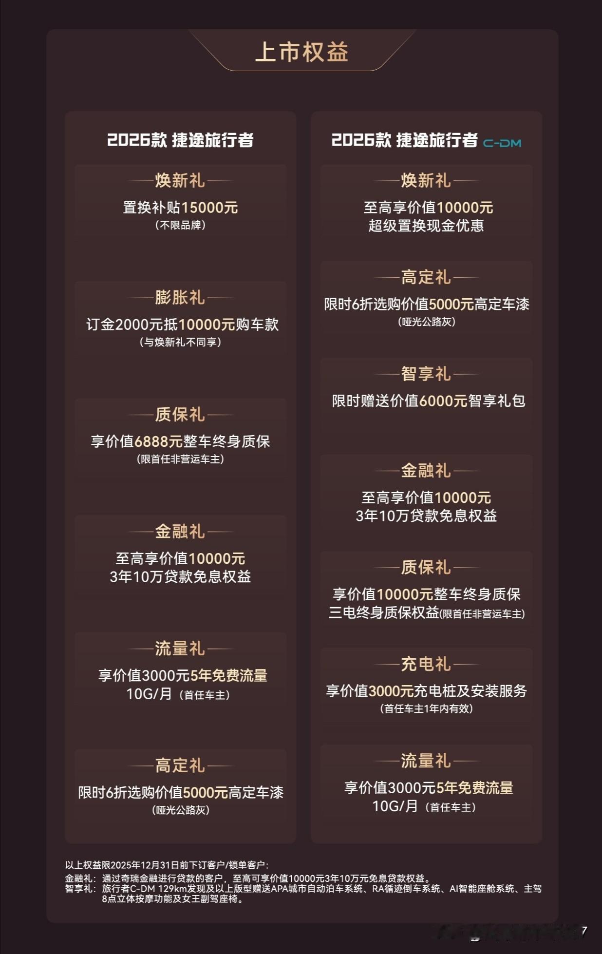 2026款捷途旅行者正式亮相,售价在13.99 - 17.99万元之间,还能享受15000元置换补贴。旅行者的外观设计十分经典,所以年度改款主要是对细节进行微调。动力上,2026款旅行者为消费者提供1.5T和2.0T发动机两种动力配置。新款车身尺寸达4795*2006*1880mm,比老款长了10mm。 一同发布的还有旅行者C - DM,它由山海T2更名而来,搭载奇瑞1.5T三挡DHT插混动力系统,四驱版配有后H臂独立悬挂。其指导价为15.99万 - 21.99万元,相比山海T2降低了2 - 3.5万元,还配备了坦克调头和华为乾坤智驾。