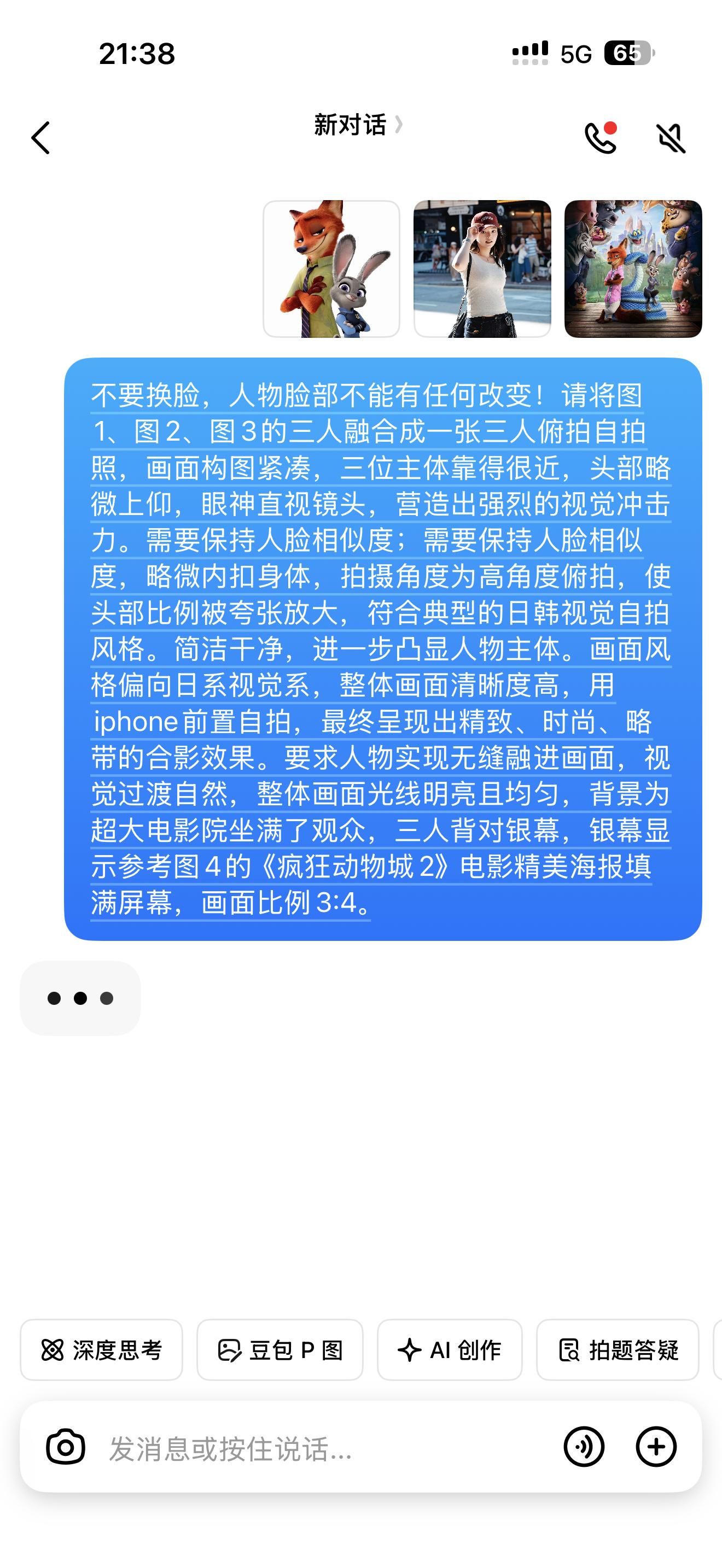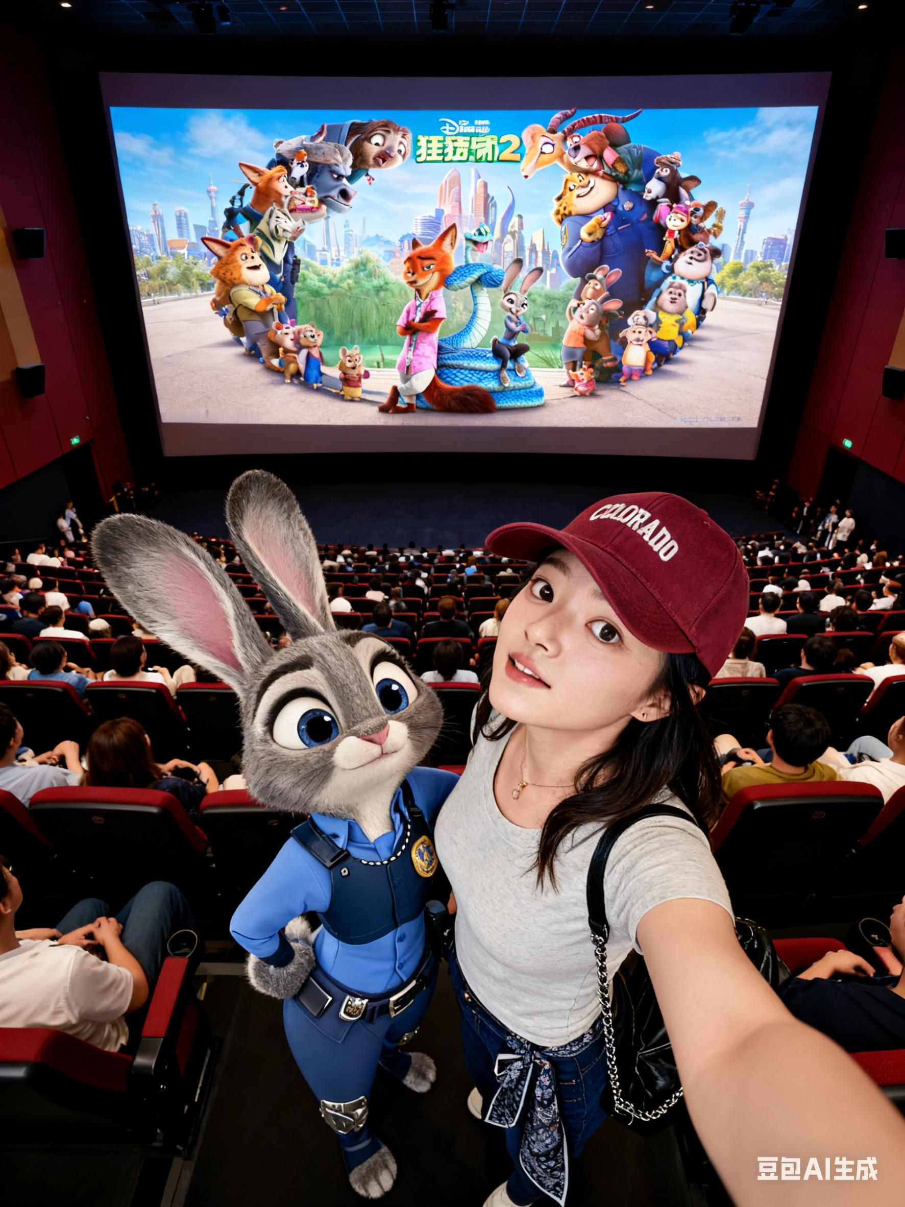 教大家用AI,我用了豆包哈哈,在电影上映前和兔子警官合个照吧第一张图可以在图3、图4任意选一张;第二张图是自拍,最好五官清楚一些(参考图6);第三张图是背景图,大家可以用图5;文案放在评论区了,期待大家的作品