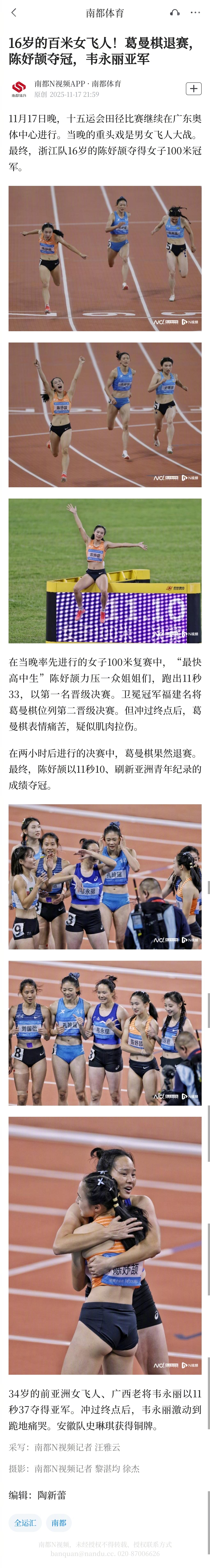 【16岁的百米女飞人!葛曼棋退赛,陈妤颉夺冠,韦永丽亚军】11月17日晚,十五运会田径比赛继续在广东奥体中心进行。当晚的重头戏是男女飞人大战。最终,浙江队16岁的陈妤颉夺得女子100米冠军。在当晚率先进行的女子100米复赛中,“最快高中生”陈妤颉力压一众姐姐们,跑出11秒33,以第一名晋级决赛。卫冕冠军福建名将葛曼棋位列第二晋级决赛。但冲过终点后,葛曼棋表情痛苦,疑似肌肉拉伤。在两小时后进行的决赛中,葛曼棋果然退赛。最终,陈妤颉以11秒10、刷新亚洲青年纪录的成绩夺冠。34岁的前亚洲女飞人、广西老将韦永丽以11秒37夺得亚军。冲过终点后,韦永丽激动到跪地痛哭。安徽队史琳琪获得铜牌。