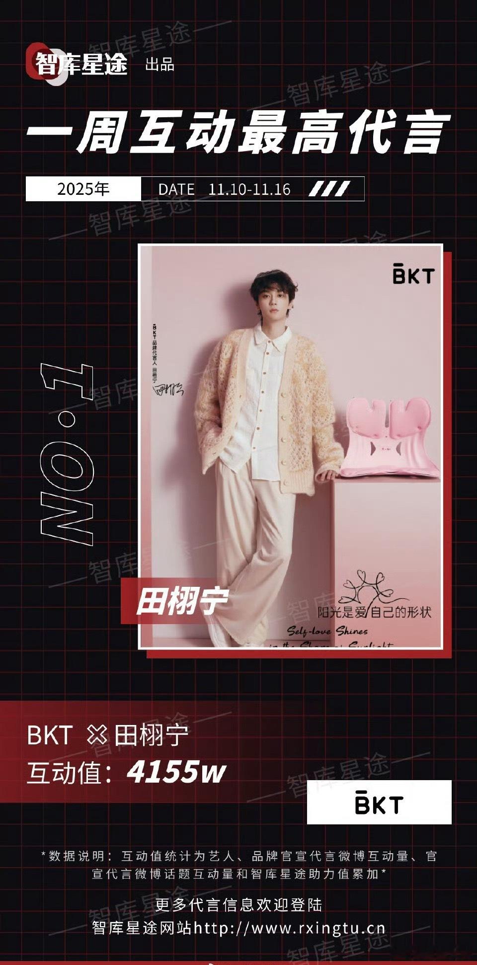 上周互动最高代言:田栩宁BKT,互动值4155w,恭喜田栩宁,仅两天就拿下一周的