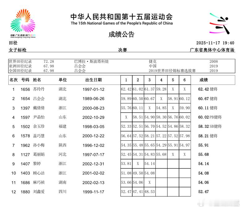 亚锦赛女子标枪冠军全运延续实力夺冠 36岁世界名将老当益壮摘银11月17日晚,全运田径大项结束女子标枪决赛,湖北选手包揽冠亚军,苏玲丹以62米42获得冠军,吕会会以60米67获得亚军,浙江选手戴倩倩60米11获得第三。今年拿下亚锦赛冠军,并在世锦赛上杀入决赛的苏玲丹,把好的状态保持到了全运会上。她的的第一投就开到了62米42的远度,事后看,这就是夺冠成绩。随后两投都超过了61米大关。早早确立胜势。67米98亚洲纪录保持者,三届世锦赛奖牌获得者、已经36岁的吕会会宝刀不老,五个有效成绩里有三个突破60米,最后凭借第三下的60米67获得银牌。今年钻石联赛柯桥站有过64米38神勇发挥的浙江选手戴倩倩,后来发挥逐渐走低,此前三场赛事没有过60米。但这场比赛,戴倩倩给出近期最佳水准,险胜山东选手尹晶怡9厘米,以60米11获得季军。