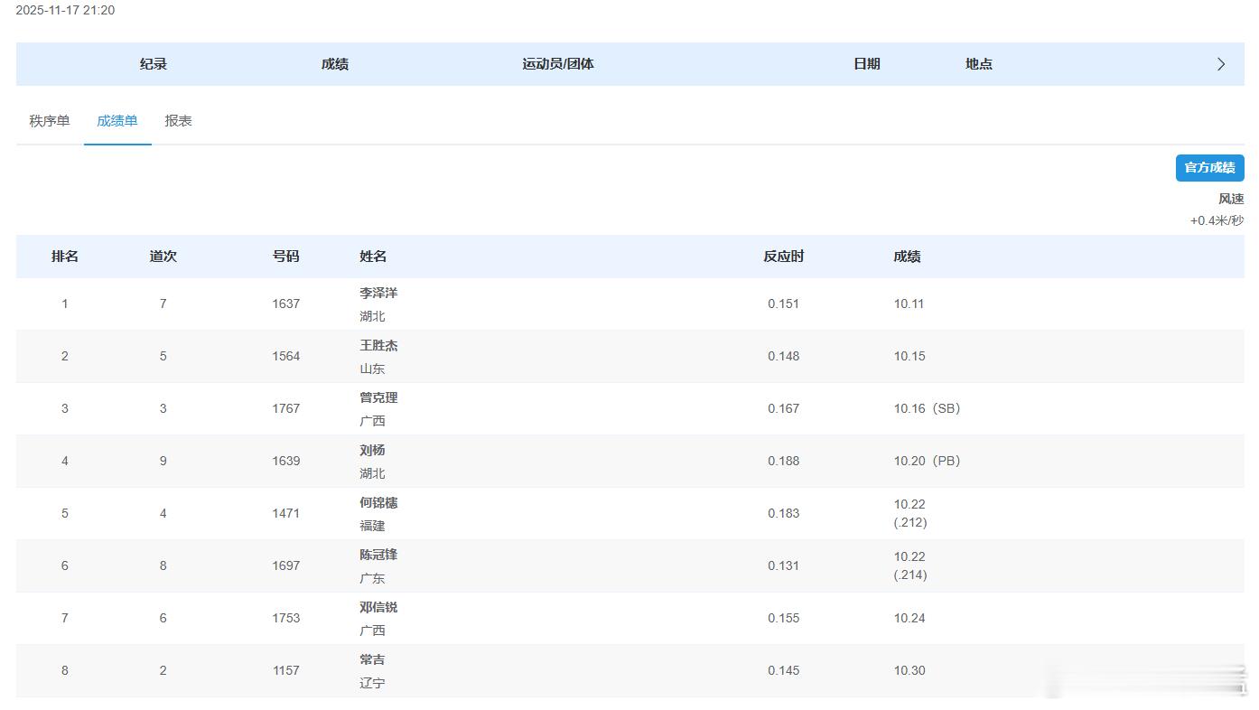 25岁湖北省队健将挑翻五大国手夺全运男子百米冠军 后半程爆发完美大逆转取胜11月17日晚,全运田径大项结束男子100米决赛争夺,湖北选手李泽洋以10秒11的成绩获得冠军,山东选手王胜杰10秒15获得亚军,广西选手曾克理以10秒16的赛季最佳成绩获得季军。比赛时风速每秒0.4米小顺风。这场决赛实力非常接近,比赛前半程看不出确定领先人选。在第七道的李泽洋,起跑一般。进入途中跑后被两侧的邓信锐和陈冠峰压制。但在最后的冲刺环节,李泽洋完全爆发,他快速杀出,终点线前确立胜利优势!李泽洋过线时高举左手庆祝,看到具体成绩后兴奋不已。25岁的李泽洋,此前没有国家队赛事经验,是一名标准省队级选手。最近两年李泽洋的百米开始走强,连续打开10秒30大关。在今年的全国锦标赛上,李泽洋跑出10秒16的个人最佳拿到亚军。这次全运会预赛和半决赛,李泽洋又相继跑出10秒08和10秒17,状态正在最高位。李泽洋除了以国字号身份集训过之外,并没有正式的国际赛事经历。而本场比赛有多达五位正牌国手参与,其中就有今年国内男子百米头号人物、广西队的邓信锐。但在这场国内男子百米最高水准对决中,李泽洋完胜所有人。邓信锐只获得第七名。历来凭成绩选人的中国国家田径队,期待明年能多给李泽洋出国作战的机会。