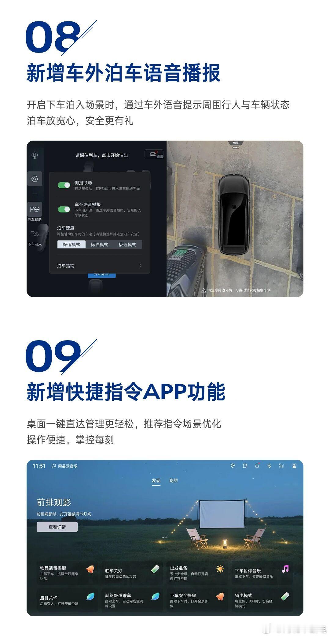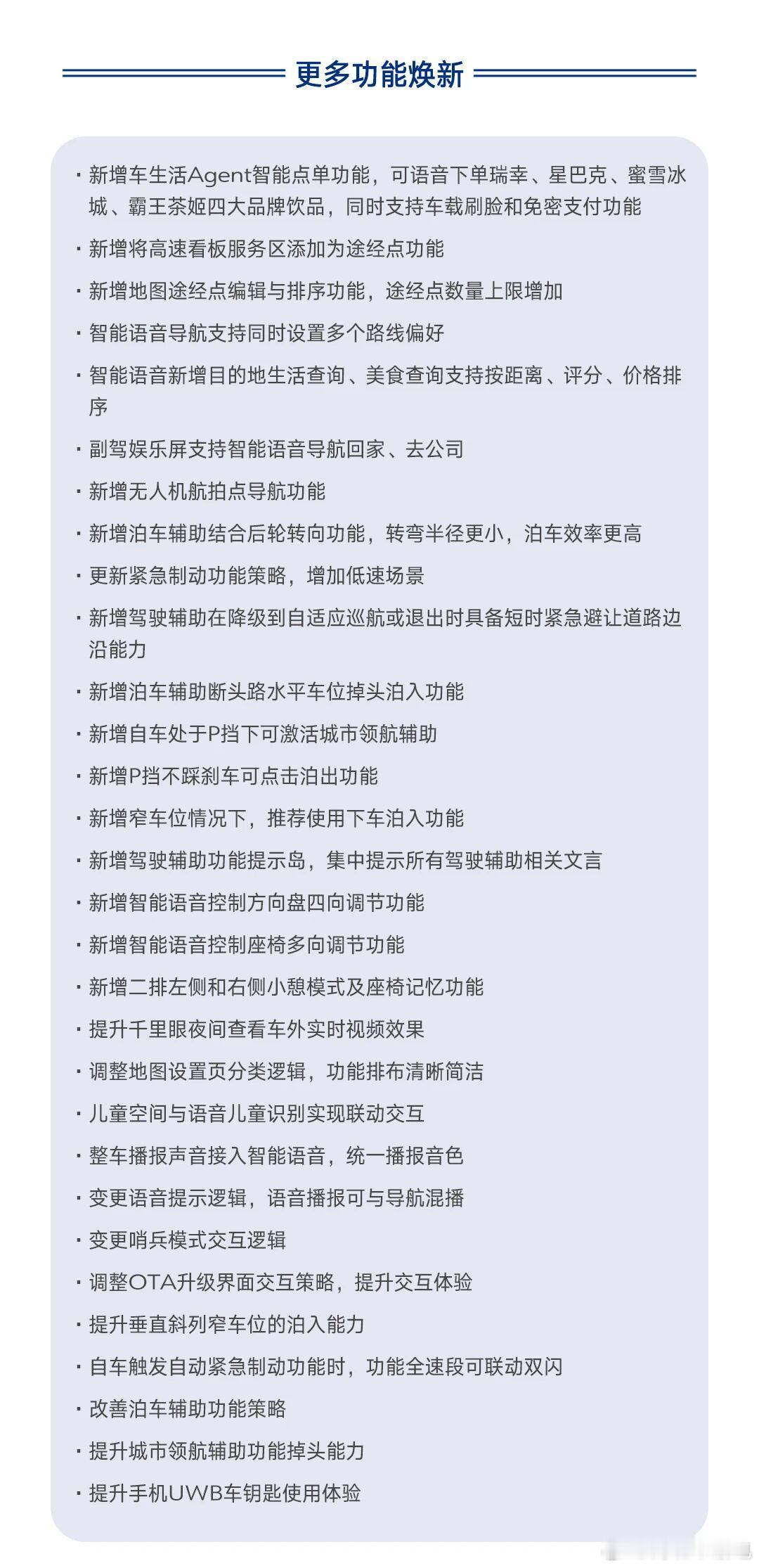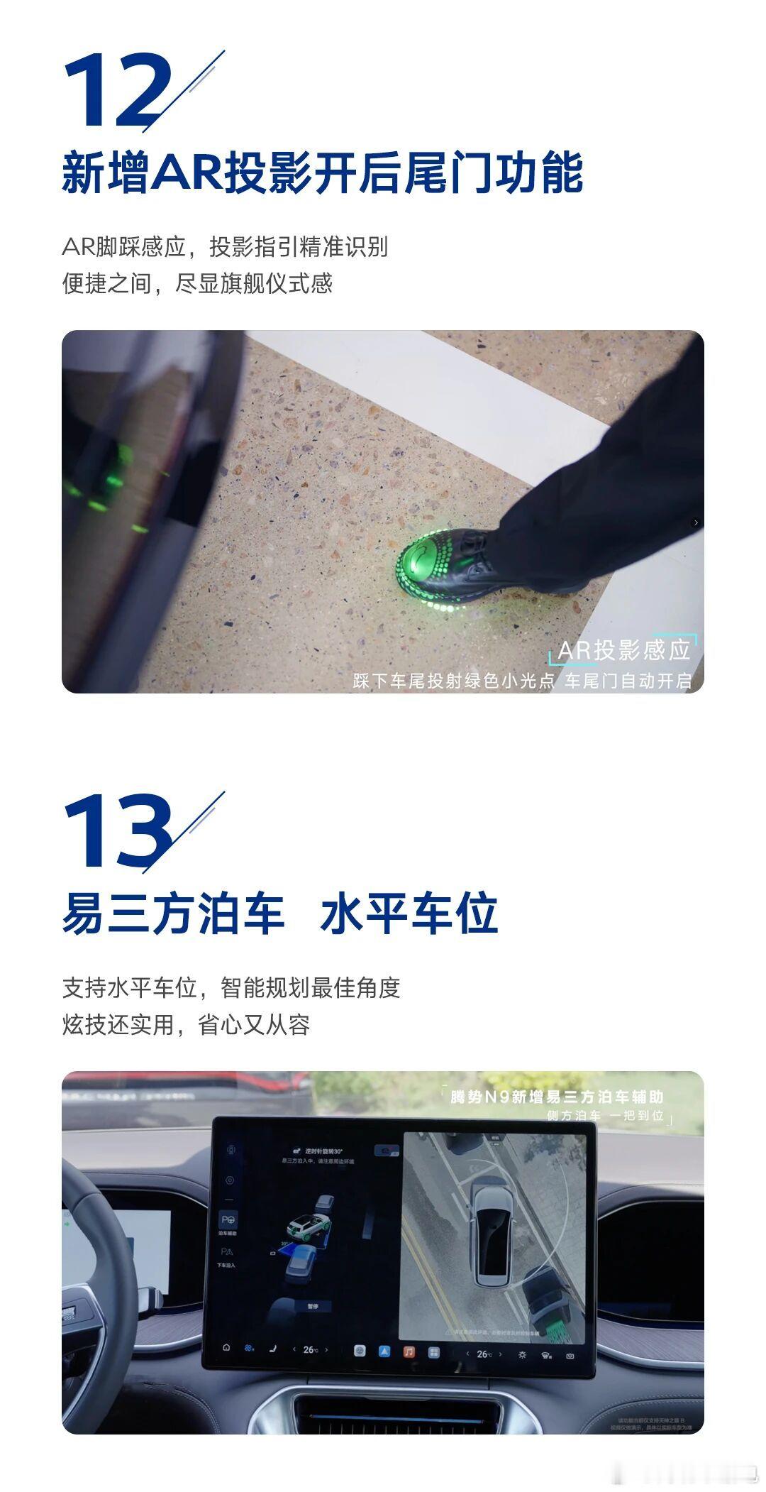 腾势 N9 新版本推送了,这次增加了几个核心功能①高圆圆语音包②全新 UI③手势开门④一键无痕⑤生命守护系统⑥新增网易云⑦增加语音音色⑧下车泊入的语音提醒⑨快捷指令 app⑩通过收费站⑪ 防晕车功能⑫ ar 投影开启后尾箱⑬ 水平车位的易三方泊车