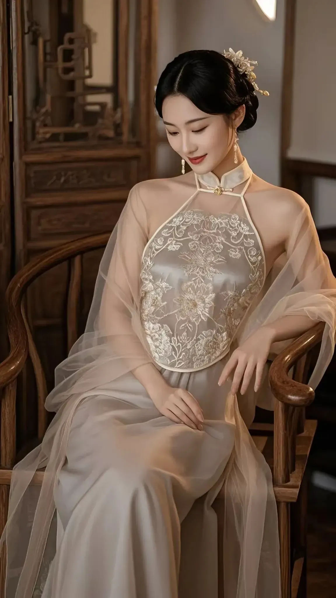 静谧空间中,玥儿目光迷离,似藏着万千心事。她的丝袜美腿随意交叠,细腻纹...