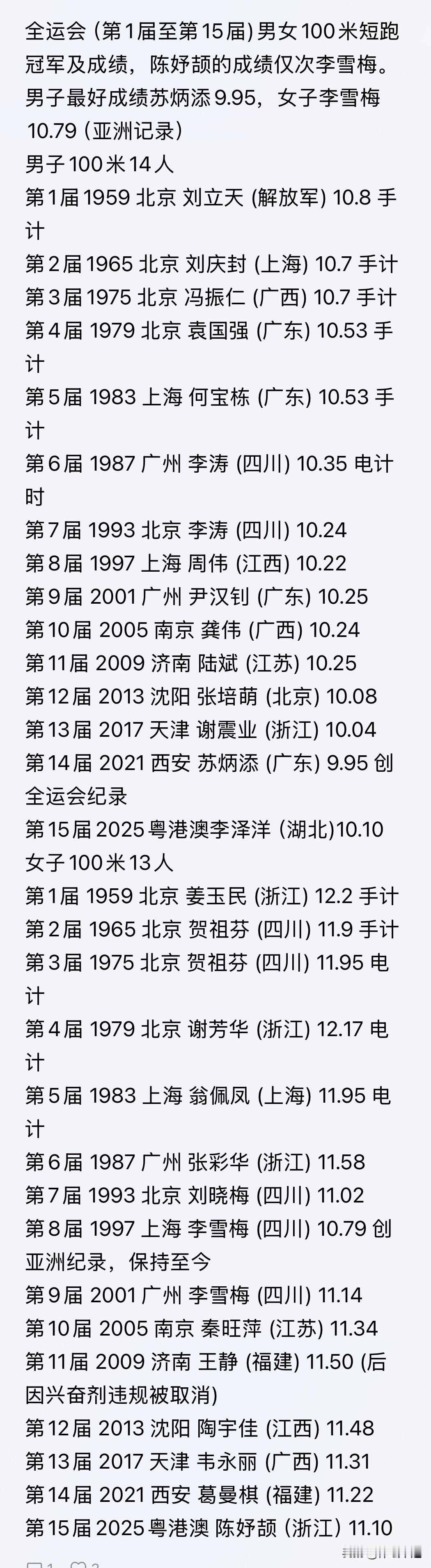 亚洲百米第一女飞人有了新的有力竞争者——16岁的陈妤颉。在11月17日第十五届全运会女子100米决赛中,她跑出11秒10,力压一众对手夺冠,还创造了亚洲U20女子百米新纪录,成为全运会历史最年轻女子百米冠军。 比赛里,她前半程和名将韦永丽不相上下,后半程迅速拉开差距,领先0.27秒冲线。预赛她跑出11秒39,半决赛11秒33,一路状态火热。出身短跑世家的她,从网球转练田径,未来潜力无限,说不定真能成为亚洲顶尖“女飞人”。 天才短跑少女 女子百米夺冠 陈妤颉钻石赛跑