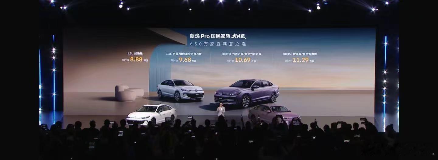 今晚,上汽大众朗逸Pro正式上市,限时售价 8.88 万-11.29 万。这个价格大家觉得怎么样?除了价格以外其实还有两年 0 利率和4000的旧换新补贴+终身质保+全系数字钥匙,这个其实就价位比例来说,诚意不错。从行业视角来看,这是比较具有进攻型的一个定价策略,稳固10万区间基本盘的市场意图明显,且价格区间带有诚意的同时,产品格局有大概半个级别的提升,包括但不限于:1、车身尺寸增加,来到了A+级,外观升级,双前脸造型,也被称为小帕萨特PRO。内饰全白+电子怀档,北欧家居风质感2、四轮独立悬架+DP- EPS上车,最具性价比四轮独悬德系家轿3、1.5T车型高配搭载了EA211 1.5T EVO II EA211和7速DSG,省油耐久,百公里油耗5.54L4、智能化也是用8155芯片等硬件+功能生态和大模型软体,L2级驾驶辅助,也拉齐同行水平,智能平权不过这辆车我个人最关心的还是德系车固有的体系质量素质和底盘的一些操控属性,找机会为大家深度解析一下。