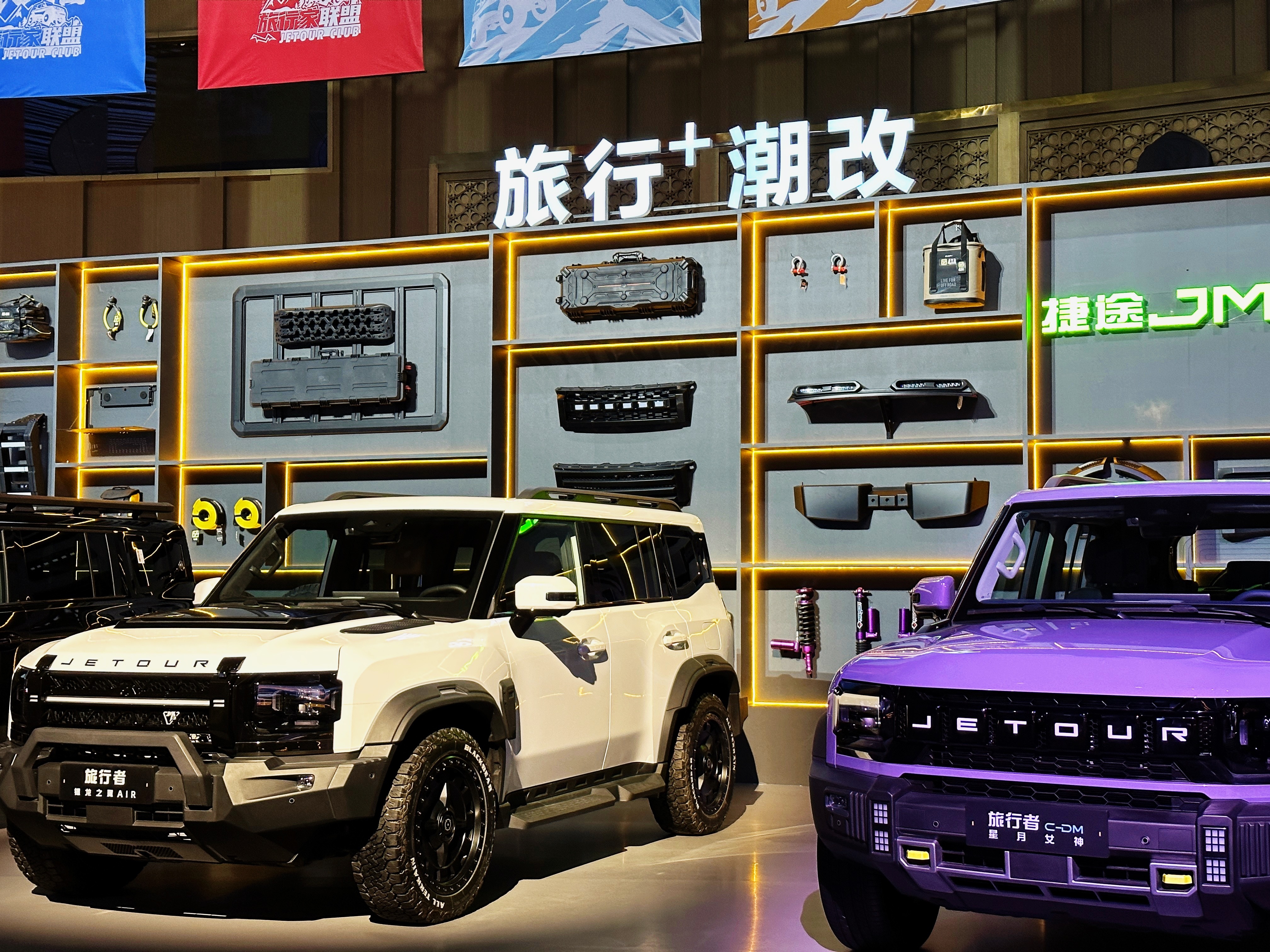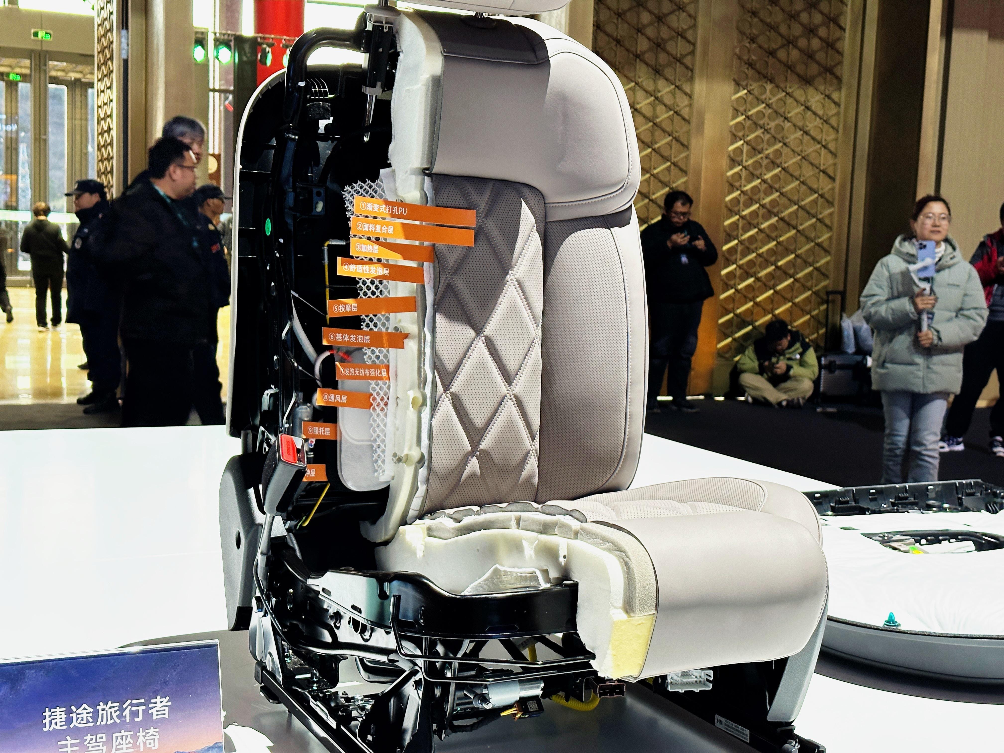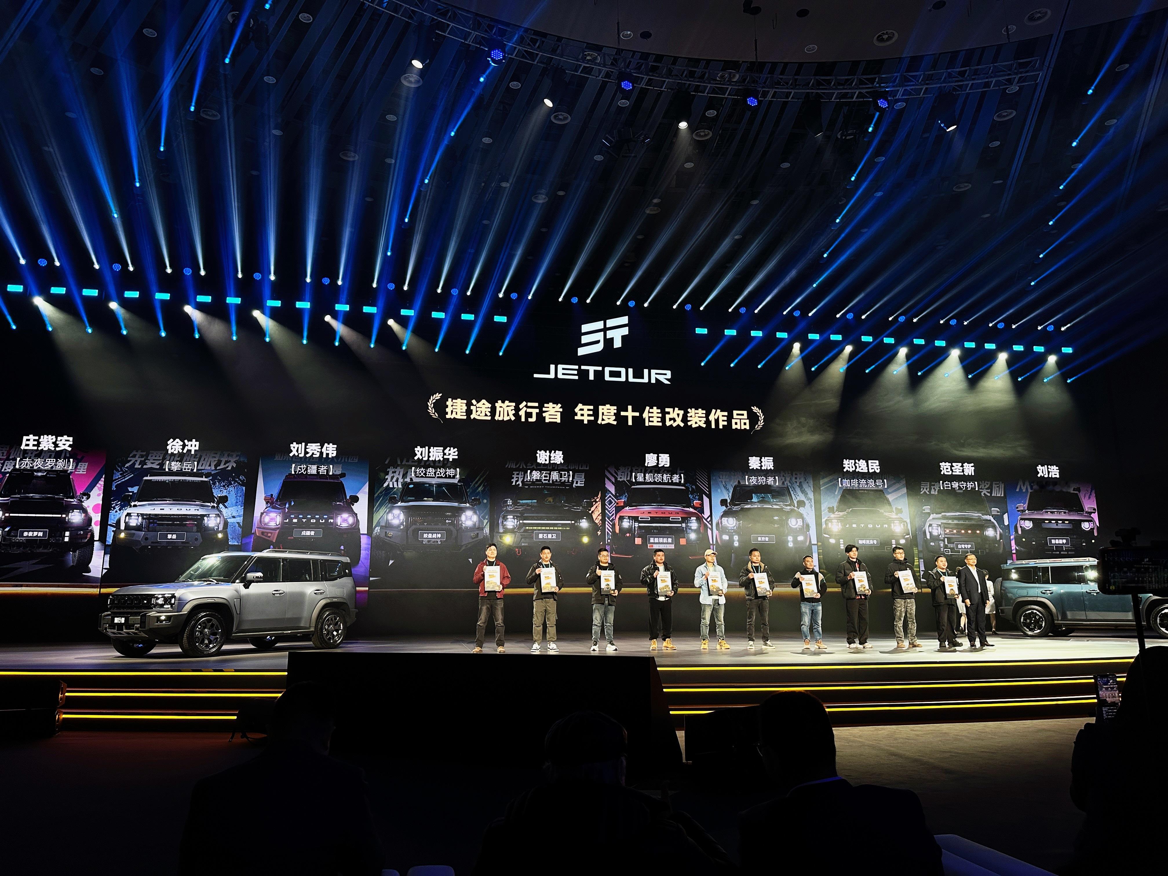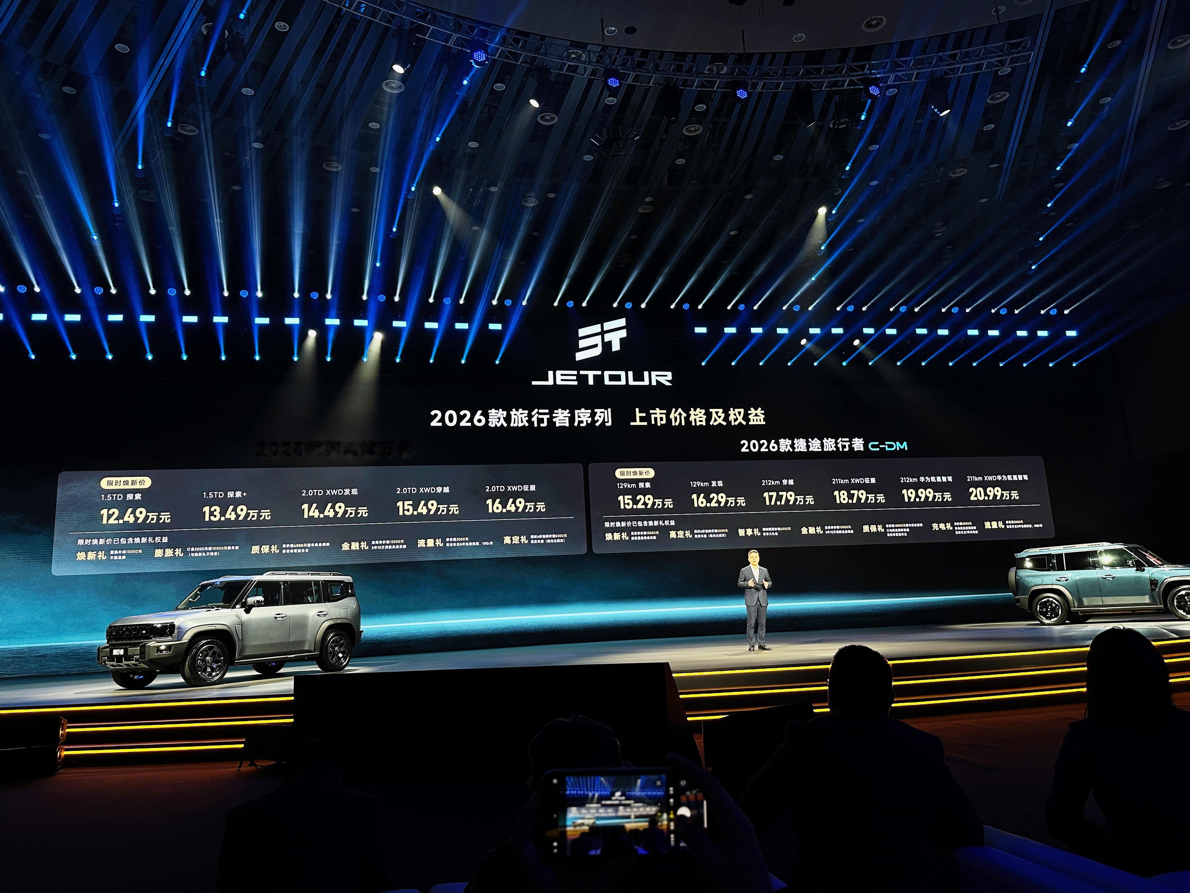 也是年度十佳改装作品的颁奖,旅行者天生适合改装,现场展出。本次升级了理想L9同款的十层座椅,更舒适。燃油版·2026款捷途旅行者12.49万-16.49万元(共5款车型)动力:鲲鹏2.0T发动机(187kW/390N·m),匹配8AT变速箱,标配XWD全自动智能四驱系统。越野性能:涉水深度700mm,车身扭转刚度31,000N·m/deg,支持7种驾驶模式(经济/雪地/泥地/岩石等)。混动版·捷途旅行者C-DM 15.29万-20.99万元(共6款车型)续航能力:纯电续航212km,综合续航1300km,馈电油耗6.53L/100km。技术亮点:搭载华为乾崑ADS 4.0智驾系统(支持高速/城区领航)、高通8255芯片+24GB运存,激光雷达集成于舱内。