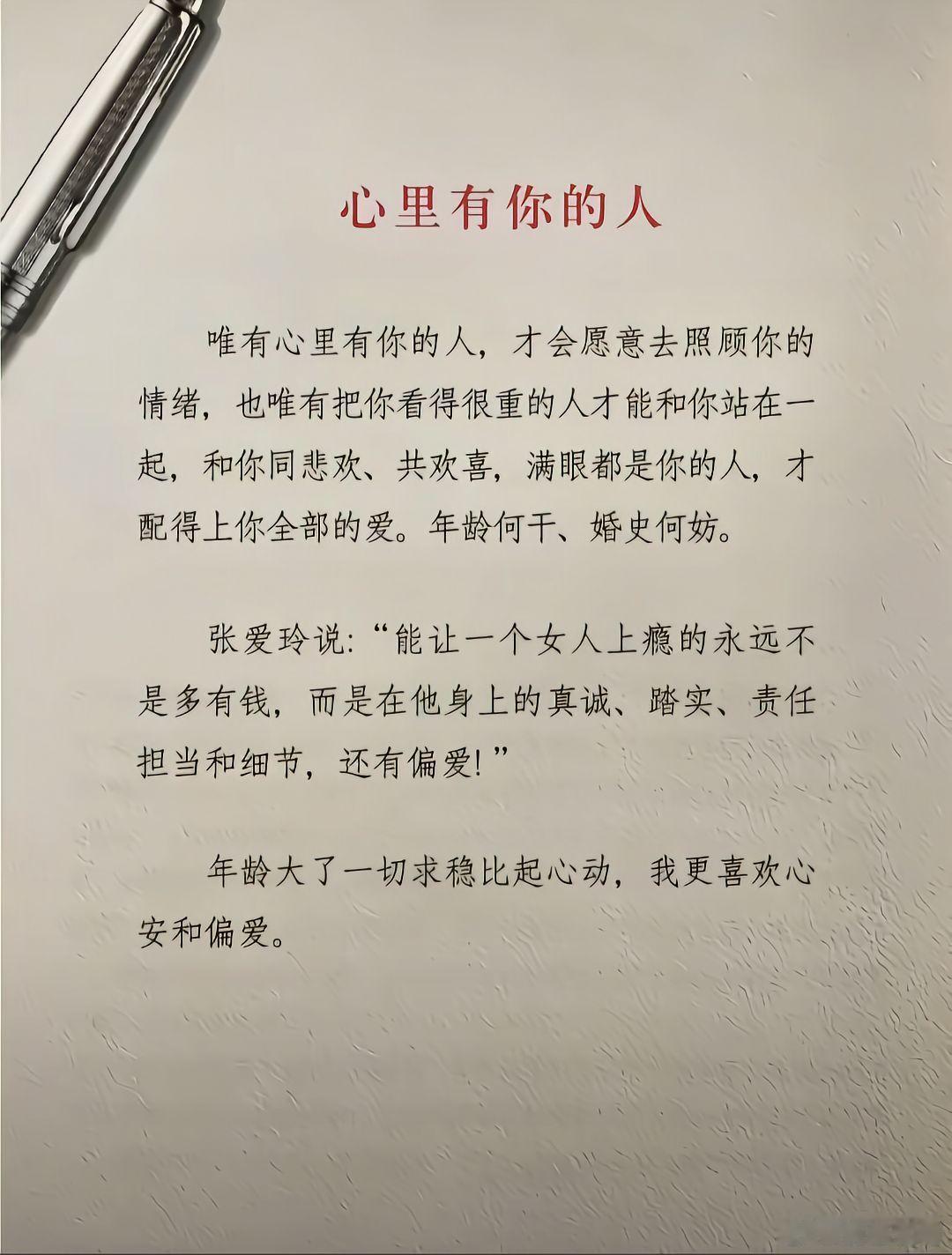 唯有心里有你的人,才会愿意去照顾你的情绪,也唯有把你看得很重的人才能和你站在一起,和你同悲欢,共欢喜,满眼都是你的人,才配得上你全部的爱。年龄何干,婚史何妨。 张爱玲说:“能让一个女人上瘾的永远不是多有钱,而是在他身上的真诚,踏实,责任担当和细节,还有偏爱!” 年龄大了一切求稳比起心动,我更喜欢心安和偏爱。