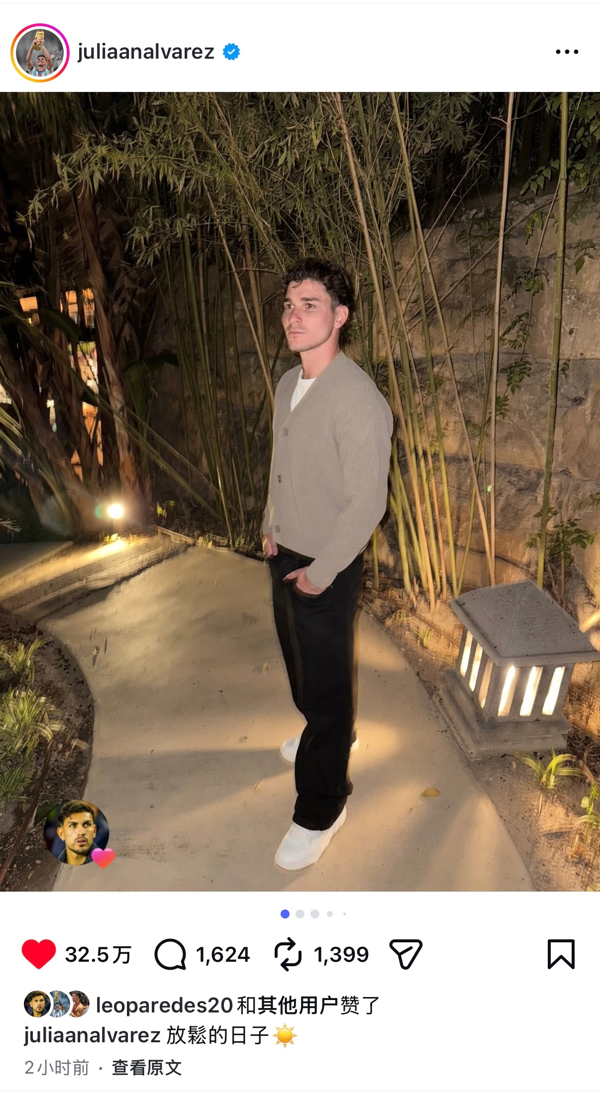阿尔瓦雷斯更新ins|放松的日子☀️小墙、迪巴拉、恩佐、罗梅罗、冈萨雷斯、阿尔马达点赞👍