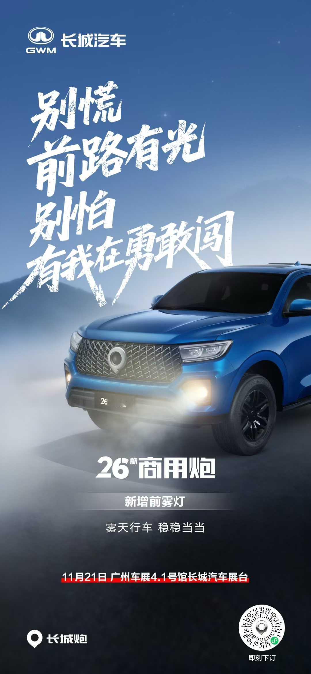 2026款商用炮新增前雾灯 雾天行车,稳稳当当 11月21日,广州车展4.1号馆见 2026款长城炮全家族焕新上市