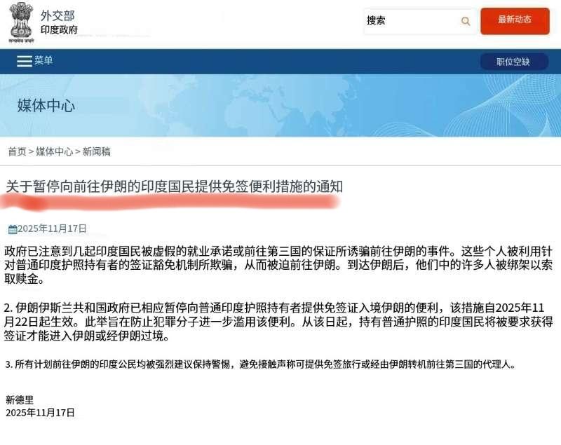 印度外交部发表声明称,伊朗已暂停向持普通印度护照前往伊朗的旅客提供免签证入境便利,该措施自2025年11月22日起生效。此举旨在防止犯罪分子进一步滥用该便利措施。 印度方面给出的解释是,有印度公民因免签政策前往伊朗被绑架、敲诈勒索的犯罪情况,而伊朗为了“顾全大局”宣布停发印度公民免签便利。 要我说,印度在给自己找台阶下,实际上此前伊以冲突中,伊朗抓获了不少在伊朗境内为摩萨德工作的印度公民,为了有备无患,伊朗采逐步收紧对印度的签证政策。 说到底,还是印度自己作的,表面在伊以之间保持中立,背地里却利用和伊朗的关系,把情报倒给以色列。如今免签取消,不过是自食其果罢了。