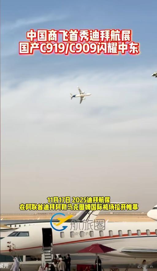 ✈️国产双机闪耀迪拜!C919携C909中东首秀,中国大飞机闯全球 太提气了!国产大飞机家族再传捷报——C919大型客机与C909支线客机组团亮相迪拜航展,这也是我国自主研发的两款明星机型首次在中东舞台同台秀肌肉🌟 作为中东地区规模最大的航空盛会,迪拜航展历来是全球航空巨头的必争之地。此次C919身着蓝白涂装,机身“中国商飞”字样格外醒目,最大载客量192座、最大航程5555公里的硬实力,让不少国际航企代表驻足咨询。一旁的C909则以灵活身姿互补,78-90座的载客规模,精准契合中东区域航线需求。 “这是中国大飞机向全球市场递出的重要名片。”现场工作人员介绍,中东是连接欧亚非的航空枢纽,此次双机亮相不仅展示了我国航空工业的自主研发成果,更瞄准了当地旺盛的航空出行需求。不少参观的中东观众拿出手机拍照,直言“没想到中国大飞机这么惊艳”。 从C919完成商业首飞到如今组团出海,中国大飞机正一步步打破国外垄断,在全球航空市场占据一席之地。此次中东首秀,无疑是国产大飞机迈向国际化的关键一步。 国产大飞机中东首秀 C919出海新突破 中国航空实力彰显