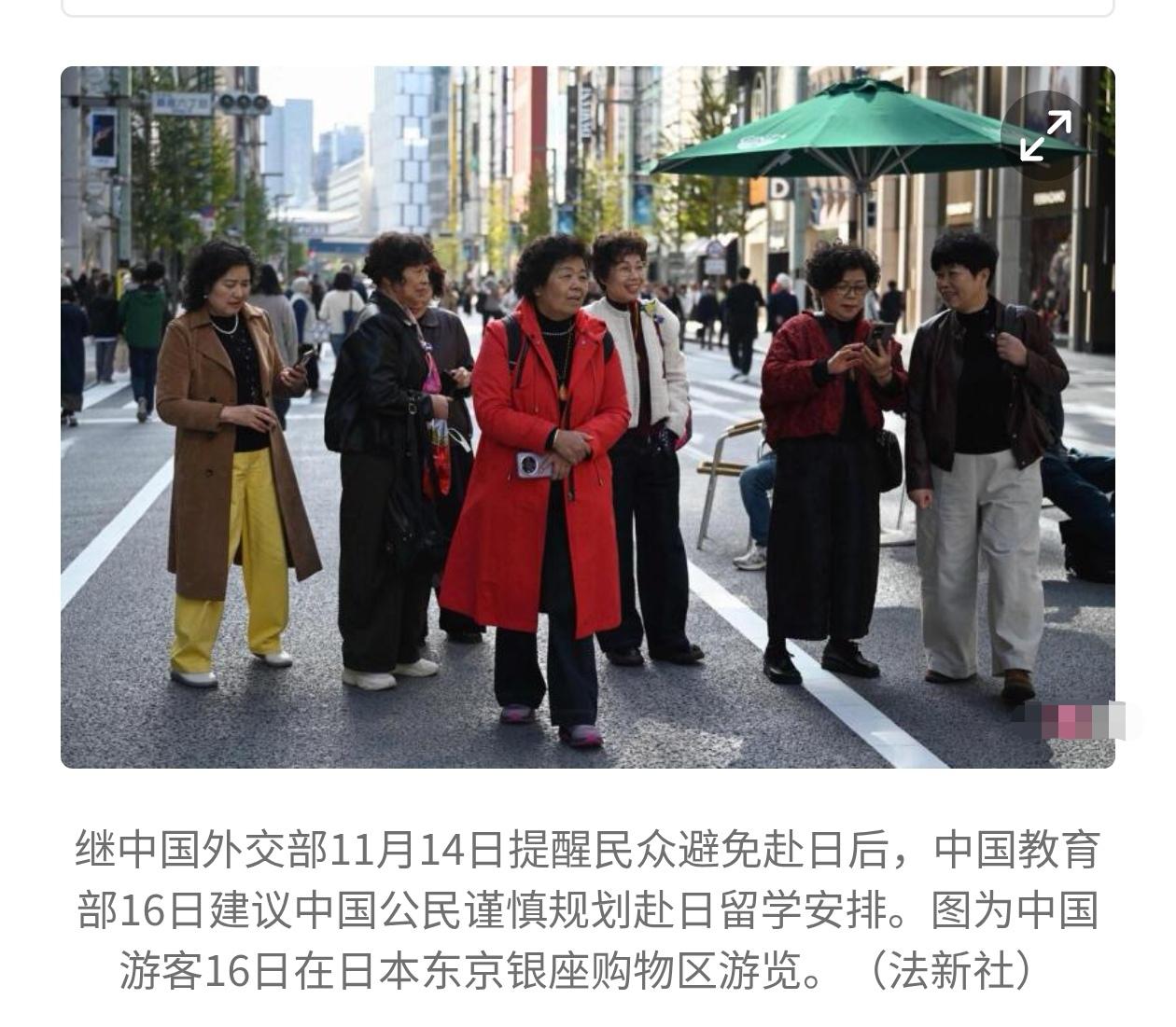 法新社昨晚(11月17日)报道:“继中国外交部11月14日发去赴日旅游安全提醒,中国教育部也建议中国公民谨慎规划赴日留学安排,但仍有部分中国游客在日旅游。” 由于受美国加征关税的影响,日本第三季度GDP下降1.8%。如果没有中国游客,将影响日本GDP的0.36%左右,所以来华的日本外务省官员今天与中方会谈的重要内容就是希望中方取消赴日旅游安全警示。昨天仍在日本旅游的中国游客,正常情况下今天将于结束。