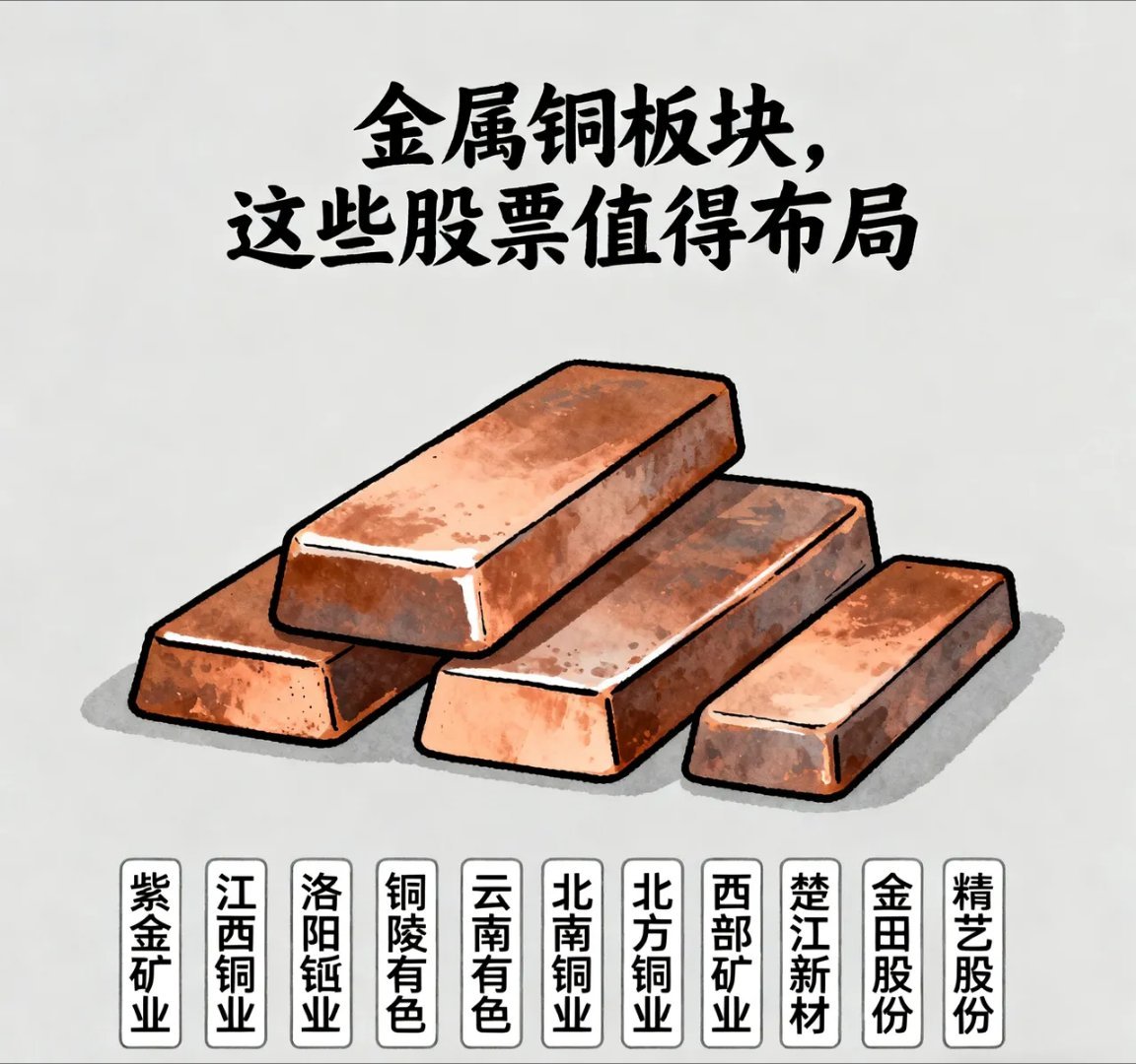金属铜板块核心标的梳理:10支高布局价值个股引领产业机遇金属铜作为“工业金属之王”,广泛应用于基建、新能源、电子等核心领域,需求端受全球经济复苏与新能源转型双重支撑。以下10支铜板块标的凭借资源储备、产业链优势或成长弹性,具备较高布局价值,具体解析如下:1. 紫金矿业全球前五大铜企,矿产铜产量稳居企,矿产铜产量稳居全球前四,铜资源储量超3400万吨,资源壁垒深厚。手握卡莫阿-卡库拉等世界级优质铜矿项目,成本控制能力行业领先,业绩与铜价联动性强,铜价上涨时盈利弹性显著,是板块核心龙头标的。2. 江西铜业国内最大综合性铜企,阴极铜年产能达140万吨,铜矿自给率超40%,产业链覆盖采选、冶炼至深加工。高端铜箔产品成功切入消费电子供应链,兼具资源属性与成长潜力,且高股息、低估值特征突出,是防御性与收益性兼备的标杆标的。3. 洛阳钼业国际化铜企代表,刚果(金)TFM与KFM两大铜矿满产运行,2025年铜产量目标直指70万吨。以铜钴双业务为核心驱动,与宁德时代深度合作锁定新能源金属供应渠道,国际化运营经验丰富,充分受益于新能源行业对铜钴资源的需求增长。4. 铜陵有色全球规模领先的铜加工企业,阴极铜产量占全国14%,铜板带材市占率达25%,细分领域话语权强。深度绑定宁德时代、比亚迪等新能源龙头,4680电池专用铜箔订单充足,精准承接新能源车与储能行业发展红利,成长确定性高。5. 云南铜业中国铜业核心子公司,旗下普朗铜矿、大红山铜矿资源储量丰富,电解铜产量位居A股前列。产业链完整覆盖采选、冶炼及深加工环节,背靠中铝集团,在资源获取、政策支持等方面具备天然优势,经营稳定性强。6. 北方铜业华北地区最大阴极铜供应商,拥有年处理900万吨矿石的铜矿峪矿,原料保障能力突出。年产5万吨压延铜带箔项目即将释放利润,产品契合电子、新能源等高端需求,股性活跃,具备较强的短期弹性。7. 西部矿业青海铜矿资源开发核心企业,铜产品收入占比达67%,业绩对铜价敏感度高。既拥有可观的铜资源储备,又具备稳定的电解铜产能,地处西部叠加资源禀赋优势,生产成本低于行业平均水平,盈利空间充足。8. 楚江新材铜基新材料领军企业,铜板带产能位居A股第一,产品广泛应用于电子元器件、新能源车等高增长领域。高端铜合金材料成功切入芯片封装、量子计算等前沿场景,技术壁垒高,成长逻辑聚焦高端材料进口替代,发展潜力巨大。9. 金田股份国内铜加工材产量冠军,业务涵盖再生铜冶炼与铜材深加工,完美契合循环经济发展趋势。在铜加工领域积累了深厚的技术与客户资源,产品性价比优势显著,行业竞争力强,业绩增长兼具稳健性与成长性。10. 精艺股份铜管加工领域细分龙头,属于“小而美”的弹性标的。虽营收规模相对较小,但在细分赛道具备扎实的技术与客户基础,资金关注度较高,股价对行业景气度、铜价波动的反应灵敏,适配短线布局需求。整体来看,铜板块标的可分为资源型龙头、产业链一体化企业与高端加工型标的三类。资源型企业受益于铜价上涨与资源稀缺性,产业链一体化企业凭借成本控制与多元业务抵御周期波动,高端加工型企业则聚焦新能源、电子等增量领域实现成长。投资者可结合铜价走势、行业需求及标的核心优势,把握细分领域龙头的布局机会。