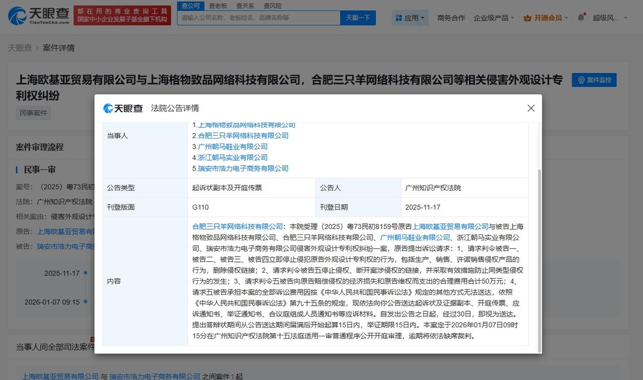 【三只羊因专利权纠纷被起诉,三只羊等被索赔50万】 天眼查天眼风险信息显示,11月17日,广州知识产权法院向合肥三只羊网络科技有限公司公告送达起诉状及证据副本、开庭传票等应诉材料。自发出公告之日起,经过30日即视为送达,并定于2026年1月7日开庭审理。 公告显示,该院受理原告上海欧基亚贸易有限公司与被告上海格物致品网络科技有限公司、合肥三只羊网络科技有限公司、广州朝马鞋业有限公司、浙江朝马实业有限公司、瑞安市浩力电子商务有限公司侵害外观设计专利权纠纷一案。原告请求判令被告一、被告二、被告三、被告四立即停止侵犯原告外观设计专利权的行为,包括生产、销售、许诺销售侵权产品的行为,删除侵权链接;请求判令被告五停止侵权、断开案涉侵权的链接,并采取有效措施防止同类型侵权行为的发生;请求判令五被告向原告赔偿侵权的经济损失和原告维权而支出的合理费用合计50万元。