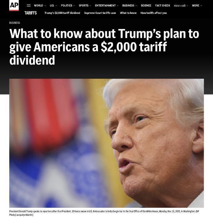 特朗普张口就来啊[捂脸],称给美国公民发2000美元关税分红。 特朗普14日在空军一号上告诉记者,计划在2026年给予美国公民每人2000美元的“关税分红”。 美国财政部长贝森特16日受访回应此事表示,称此举须经国会批准、制定新法。 根据估算,若特朗普发现金方案成真,成本可能高达6000亿美元,相当于美政府预期2025年关税收入的2倍。
