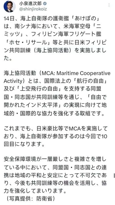 11月18日,日本《读卖新闻》报道:“防卫大臣小泉进次郎披露,14日日本海上自卫队曙号驱逐舰与美尼米兹号航母、菲律宾护卫舰在南海举行日美菲联合演习,这是日方第十次参与该活动,小泉表示,演习旨在践行自由开放的印太倡议,维护航行与飞越自由,强调复杂安全环境下需强化盟友合作以护地区稳定,此次演习是三国今年第8次相关联动,中国南部战区出动轰炸机编队巡航作出回应。” [机智]美日菲南海第八次演习,是包装在自由开放话术下的阵营对抗的一个缩影,小泉进次郎口中的维护稳定,实则是日本借同盟之名,行军事扩张之实,其谋求菲律宾合法驻军权、染指南海事务的野心昭然若揭!所谓航行自由,不过是搅局借口,三国在黄岩岛附近挑衅,本质是试图用军事施压打破区域平衡,但中方轰炸机编队挂载实弹巡航的回应,早已跳出口头抗议旧循环,直接以硬实力划下红线,日本若执迷于充当遏华棋子,终将在东海、南海的双线压力中自食恶果!