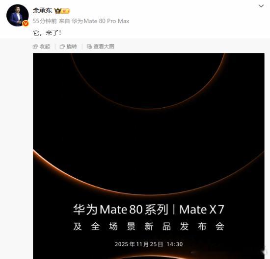 华为Mate 80系列真机首秀:双圆环设计亮眼华为常务董事、产品投资委员会主任、终端 BG 董事长余承东在微博发文宣布:“它,来了!”值得一提的是,这条博文的机型水印是华为 Mate 80 Pro Max。同样在17日上午,华为终端官微宣布:华为 Mate 80 系列 / Mate X7 及全场景新品发布会定档 11 月 25 日。余承东首次公布了华为 Mate 80 系列的真机外观。华为 Mate 80 系列延续了系列以往的圆环镜头模组设计,但在镜头模组下方,还有一个类似尺寸的浅色圆环,可能是磁吸环,可适配磁吸生态配件。