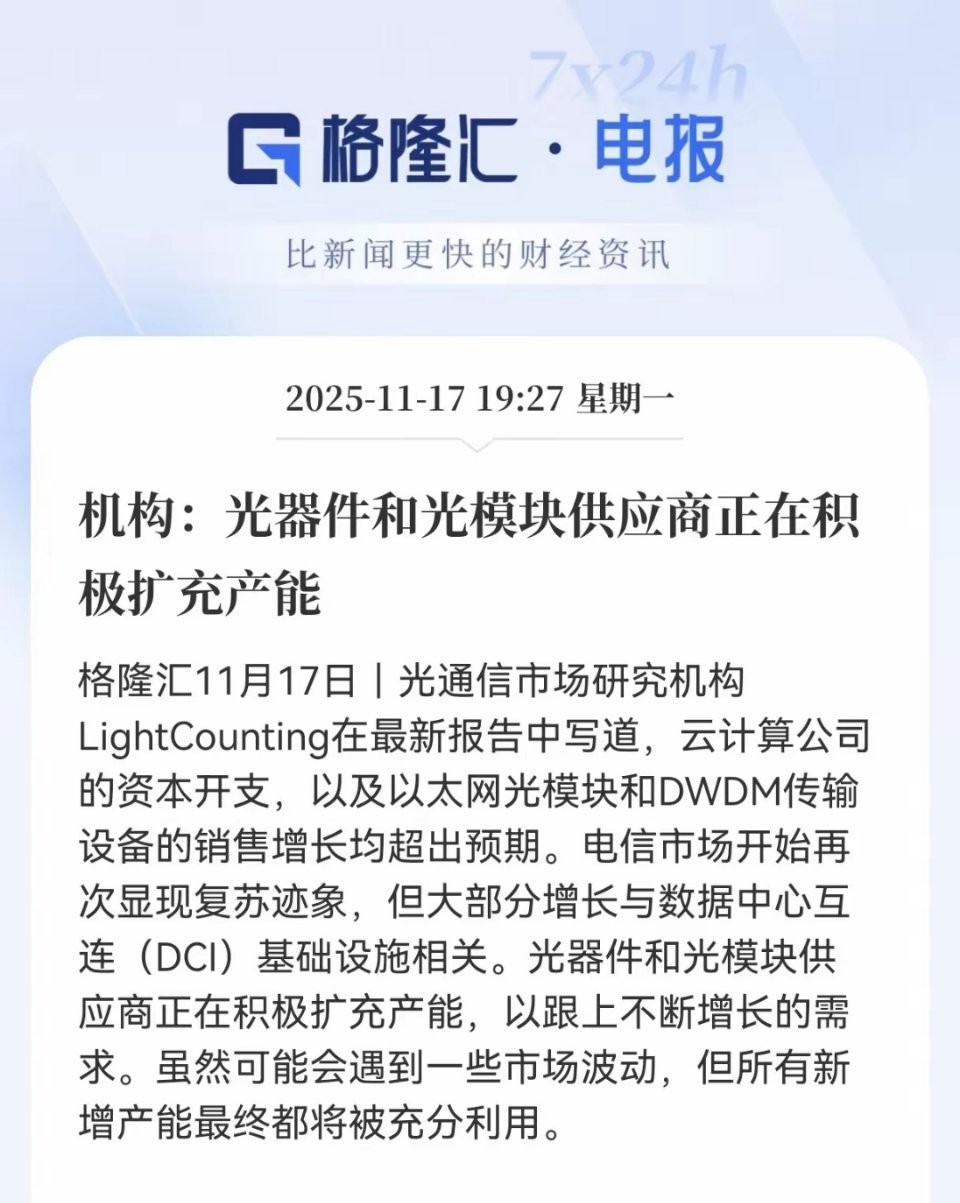 超级利好!超级利好!光器件、光模块行业扩产潮来袭,算力基建需求成最大推力,相关产业链将会迎来资金关注。 光通信领域正迎来新一轮产能扩张浪潮。根据LightCounting最新报告,云计算企业资本开支超预期,以太网光模块、DWDM传输设备销售增长强劲,数据中心互连(DCI)基础设施成为核心增长引擎,这直接驱动光器件和光模块供应商积极扩充产能。 从行业逻辑看,AI算力爆发带动数据中心对高速光互连的需求呈指数级增长,800G光模块已进入大规模部署阶段,1.6T光模块也在加速研发。同时,电信市场复苏迹象显现,进一步叠加了行业增长动能。虽然短期可能面临市场波动,但长期来看,随着AI、云计算等下游需求的持续释放,新增产能最终将被充分消化。以下是与光器件、光模块扩产及光通信产业链高度相关的股票梳理,覆盖从上游芯片到下游模块的全环节:一、光模块核心龙头 中际旭创(300308):全球800G光模块市占率第一,1.6T光模块已进入客户验证阶段,是AI算力基建光模块环节的绝对龙头。剑桥科技(603083):800G光模块快速起量,客户覆盖北美云巨头,同时布局电信光模块,受益于数据中心与电信市场双轮驱动。 新易盛(300502):800G光模块规模化交付,在国内云厂商及海外市场均有突破,400G/800G产品矩阵完善。天孚通信(300394):光器件领域龙头,为光模块提供陶瓷插芯、光引擎等核心组件,深度绑定全球头部光模块厂商。二、光芯片与光器件 源杰科技(688498):国内10G/25G/50G激光器芯片龙头,正在突破100G及以上高速光芯片,是光模块国产化的核心支撑。仕佳光子(688133):PLC分路器全球市占率第一,同时布局AWG芯片、光放大器等,在光传输无源器件领域优势显著。 光库科技(300620):主营光纤激光器件、光通讯器件,在铌酸锂调制器、高功率光纤器件领域技术领先,受益于光模块高速化趋势。 腾景科技(688195):提供高精度光学元件,如准直透镜、折射棱镜等,是光模块及光传输设备的关键配套商。三、光传输设备与配套 亨通光电(600487):光通信全产业链布局,涵盖光纤光缆、光模块、光传输设备,在海底光通信、数据中心互联领域优势明显。 烽火通信(600498):国内光传输设备龙头,DWDM设备市场份额领先,受益于电信市场复苏及数据中心互连需求增长。 通宇通讯(002792):布局光模块封装及光传输设备,在数通与电信领域均有产品落地,产能扩张节奏与行业需求匹配。四、配套设备与材料 光迅科技(002281):国内光通信器件及模块综合供应商,在光芯片集成、光模块封装领域技术深厚,产品线覆盖数通与电信市场。太辰光(300570):主营光纤连接器、光模块等,在工业级光通信领域布局深入,受益于数据中心与电信网络的光互连升级。中瓷电子(003031):为光模块提供陶瓷封装外壳,在高速光模块封装材料领域具备技术壁垒,直接受益于光模块产能扩张最后提醒:投资有风险,入市需谨慎。